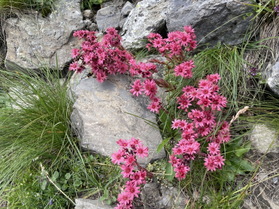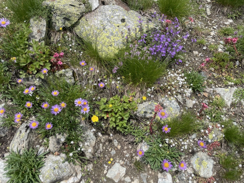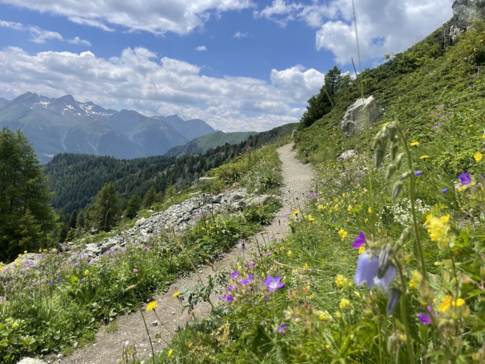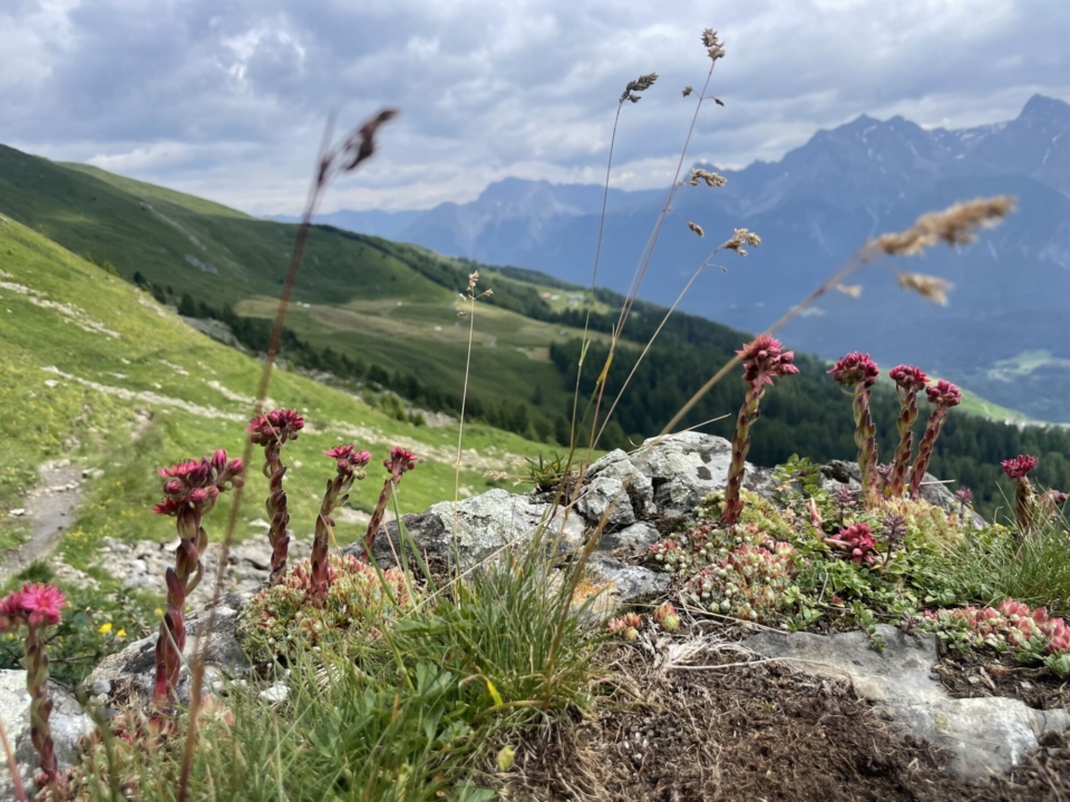 Mit vollem Magen mache ich mich auf für das letzte Teilstück der Tour. Der Weg führt traversierend zurück im etwas mehr „Ab“ als „Auf“ nach Priu. „Einfach auslaufen“ denke ich. Aber weit gefehlt! Dieser voll südorientierte Steilhang ist ein absolutes Bergblumen-Paradies! Sowohl die trockenliebenden wie die feuchtliebenden Exemplare haben hier ihr schmuckes Plätzchen gefunden. Und das eingepackt mit einer schönen Aussicht auf Ftan und das Schloss Tarasp!
