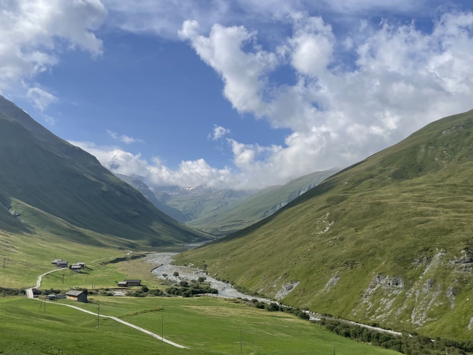 Schon die Fahrt ins Avers ist ein Erlebnis. Das Postauto schlängelt sich nach Andeer durch eine enge Schlucht ins Tal, das wohl die meisten Schweizer nicht kennen. Bis zum Ende des 19. Jahrhunderts war hier im Winter kein Durchkommen. Weiter oben wird es breiter und endet in einem grünen Paradies für Kühe und Murmeltiere oberhalb der Baumgrenze, das sich bis Juf, der höchsten bewohnten Siedlung der Schweiz auf 2100m zieht. Wir steigen aus beim Hotel Bargalga (Haltestelle Rufana) und beginnen hier – nach einem feinen Stück Nusstorte (frisch aus dem Ofen!) – unsere kleine Expedition „Bergell-Umrundung“.