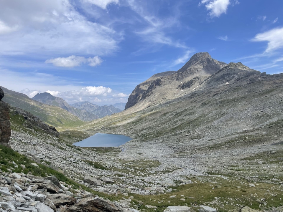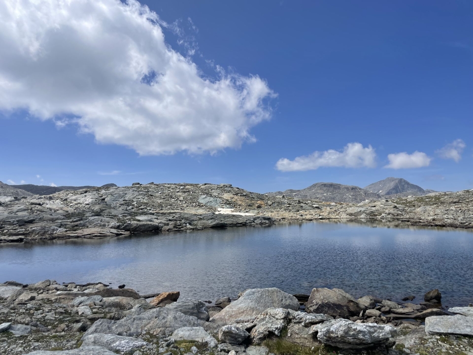 Viel „Bergell“ sehen wir hier noch nicht, dafür aber eine endlose Mondlandschaft aus Blöcken, verziert mit kleinen Seen. Wunderschön! Wenige Blümchen zeugen von Leben, aber wie sich die zwei Steinböcke ernähren, die vor uns auftauchen, bleibt uns ein Rätsel.