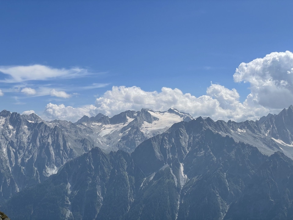 Wir folgen den Wegweisern hinunter ins Val Duana, zweigen aber bald wieder südlich ab zum Duana-Pass. Der kleine Abstecher „kostet“ 50 Höhenmeter und je 10-15 Minuten Weg – aber die lohnen sich! Denn als wir die Wasserscheide erreichen, werden wir mit einer erstklassigen Sicht auf die kecken Bergeller Granitgranden und Gletscher beglückt. Wow – was für ein Schaufenster!! Die Abbruchstelle des dramatischen Bergsturzes am Piz Cengalo lässt uns schaudern, der mächtige Gletscher am Pizzo Castello glitzert um die Wette, und und und. Ein wunderbarer Auftakt unseres Bergellabenteuers!