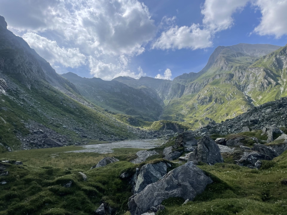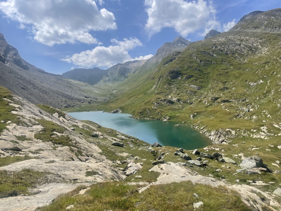 Trotzdem, das Val Duan ist zauberhaft – und wie abgelegen es ist, merken wir auch nochmals, als wir über eine sehr steile Rampe in kürzester Zeit mehr als 400 Höhenmeter ins tiefere Val Maroz absteigen müssen. Dort erwartet uns „normales“ Wandern über ausladende Kuhweiden bis hin zur Einmündung des Seitentals, das auf den Septimerpass führt.
