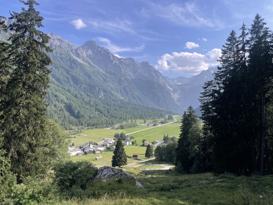 Kurz vor dem Talboden in Casaccia – im fernen Hintergrund die Albigna-Staumauer