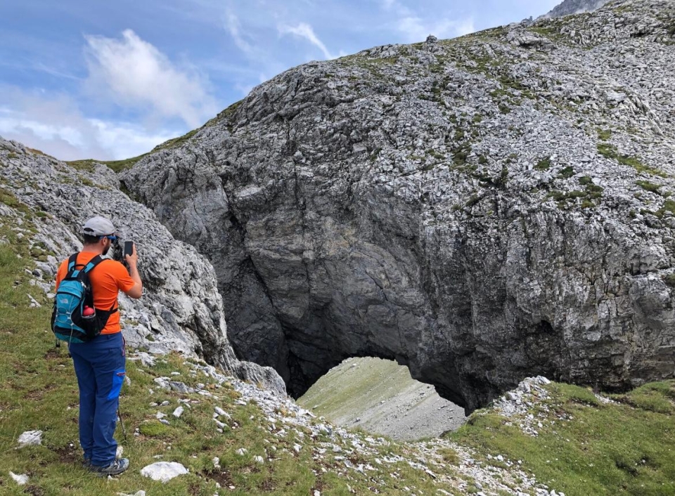 Und dann passiert das, womit wir nicht mehr gerechnet hatten: Beim facettenreichen Abstieg dreht der Wind, und im Nu sind die Wolken weg. Die Windjacke weicht, und die letzten Höhenmeter zum Fisetenpass werden mit T-Shirt only vernichtet. Trotzdem werden die Steinmännchen geschätzt, ohne sie wäre die Wegfindung anspruchsvoll. Wir nehmen uns aber auch genug Zeit, um die vielen bizarren Felsformationen zu studieren. Insbesondere die „Riesenlöcher“ im Grat (auf der LK 1:25000 als „Rund Loch“ bezeichnet) üben ihre Faszination aus.