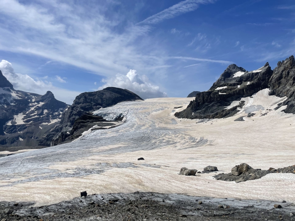 Wenige Hundert Meter weiter oben, wo unsere Route den Wanderweg verlässt und durch eine Moränenlandschaft an die Gletscherzunge des Claridenfirn führt, entscheiden wir uns für ein „Go“. Wir vertrauen darauf, dass der Wind die Oberhand behält und uns die Sicht zumindest für die nächste Stunde freihält, in der die Orientierung oberste Priorität hat. Beim Zungensee betreten wir den Gletscher und steigen zur Lücke hoch, der uns den Aufstieg auf den Gipfelgrat erlaubt. Hinter uns „kocht“ die Wolkendecke vor dem Tödi, immer wieder greifen wir zur Kamera, um diese Bilder festzuhalten. Die letzten Meter zur Lücke sind anstrengend, rund 50 Höhenmeter müssen durch einen äusserst steilen, rutschigen Schutthang bewältigt werden, die Schlüsselstelle der Tour.