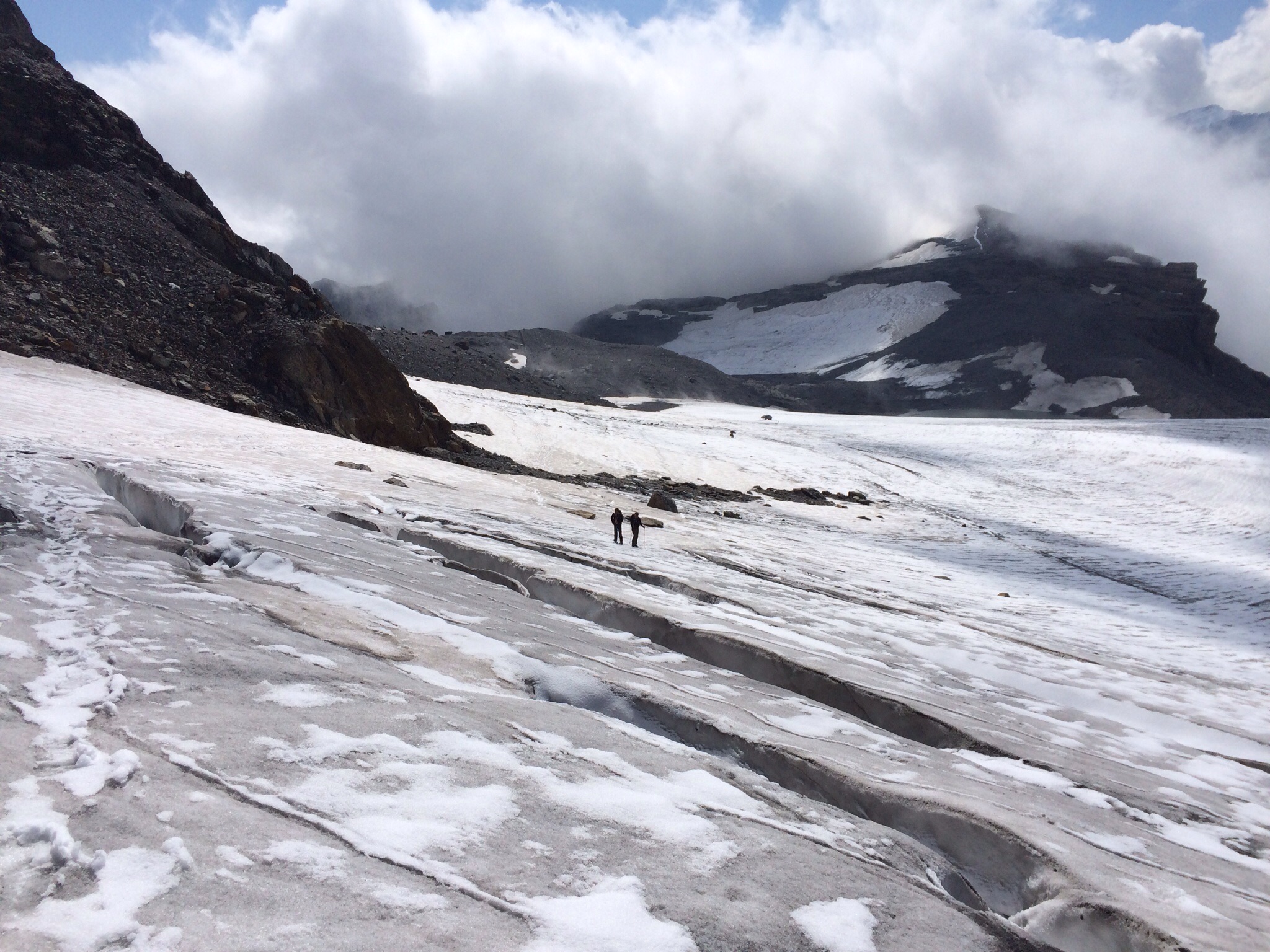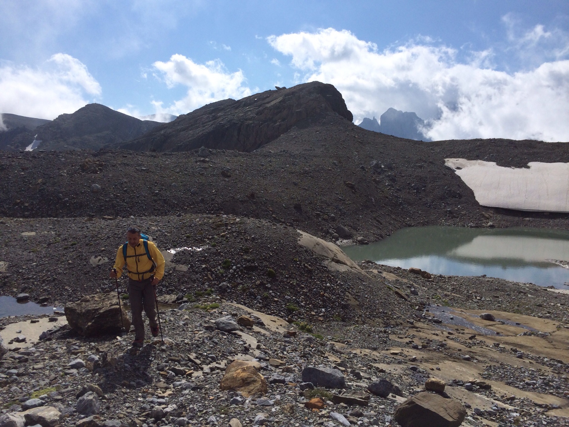 Nachtrag vom 15. August 2024 (alleine): Bei prächtigsten Wetter in umgekehrter Richtung. Nach dem Abstieg vom Joch – unverändert anspruchsvoll, auch wenn sich zunehmend ein Pfad bildet – habe ich diesmal die blaumarkierte Route zur Hütte genommen. Der ursprüngliche Route (siehe Karte), etwas weiter unten am Zungensee vorbei und ein Stück über den Gletscher würde ich jedoch weiterhin bevorzugen! Im Aufstieg zum Gipfel haben die blauweissen Markierungen die Wegfindung in diesem sehr spannenden Gelände massiv vereinfacht.