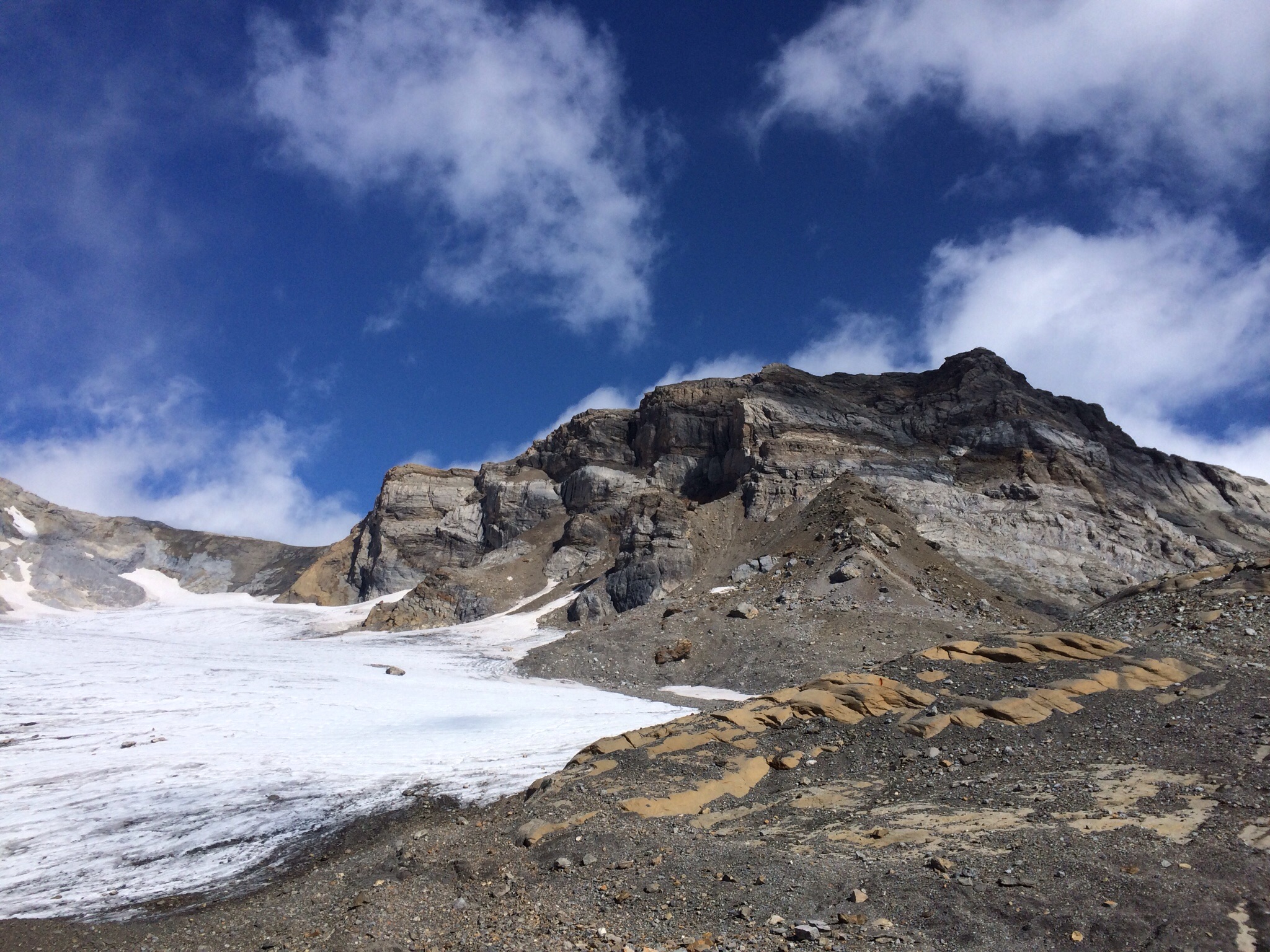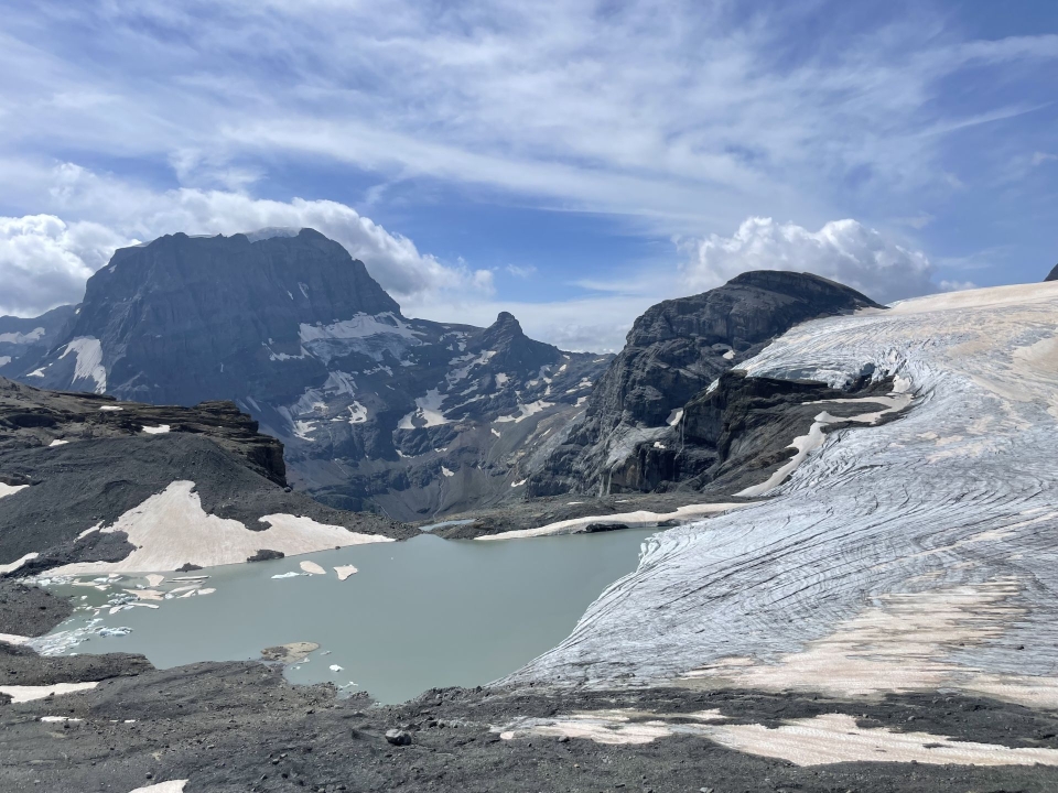 Nachtrag vom 15. August 2024 (alleine): Bei prächtigsten Wetter in umgekehrter Richtung. Nach dem Abstieg vom Joch – unverändert anspruchsvoll, auch wenn sich zunehmend ein Pfad bildet – habe ich diesmal die blaumarkierte Route zur Hütte genommen. Der ursprüngliche Route (siehe Karte), etwas weiter unten am Zungensee vorbei und ein Stück über den Gletscher würde ich jedoch weiterhin bevorzugen! Im Aufstieg zum Gipfel haben die blauweissen Markierungen die Wegfindung in diesem sehr spannenden Gelände massiv vereinfacht.