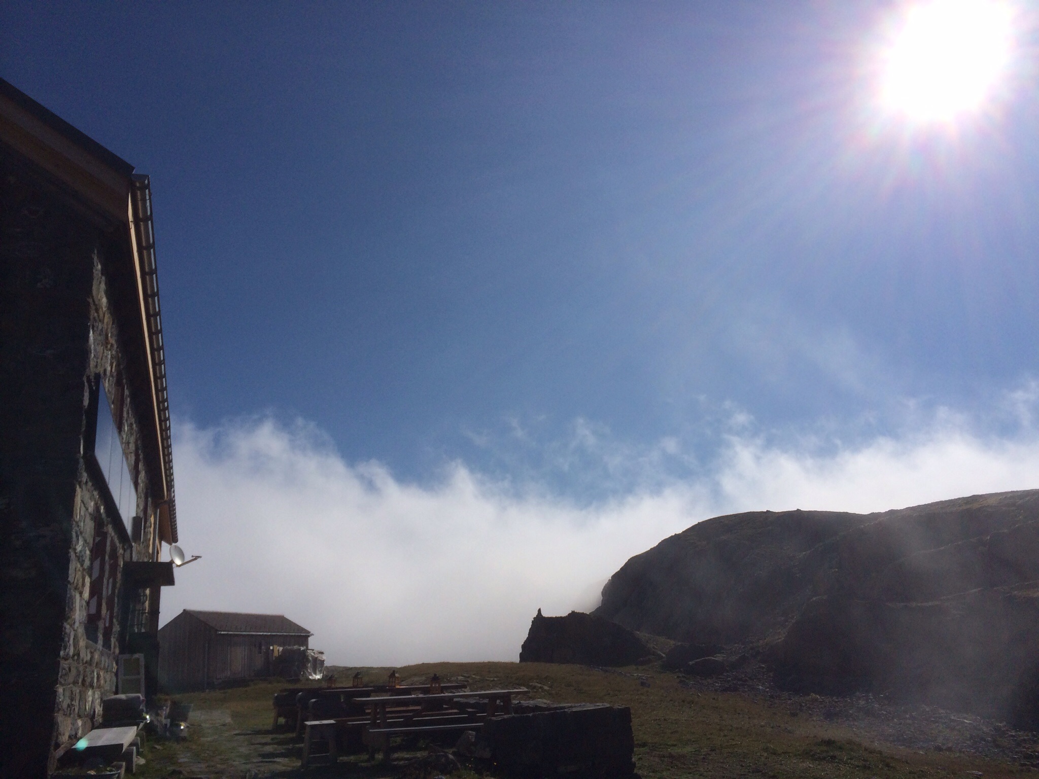 Tatsächlich finden wir die Sonne genau auf der Höhe der Hütte. Die Wolkendecke bewegt sich auf und ab, der Westwind drückt sie nach unten, die Thermik schiebt sie wieder hinauf. Der Helikopter, der die Hütte versorgen will, dreht nach vergeblichen Landeversuchen wieder ab. Wir schauen dem Treiben vergnügt zu und verschlingen zur Stärkung ein Stück der Linzertorte, die die Hüttenwartin gerade aus dem Ofen genommen hat.