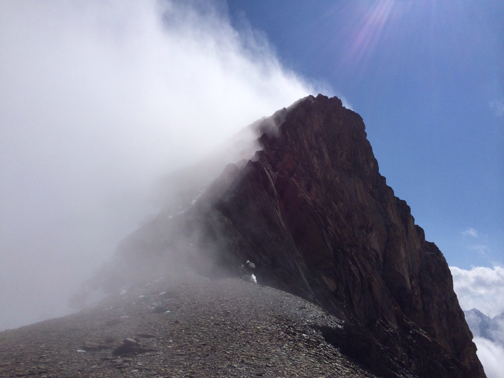 Auf dem Grat erwartet uns nicht unerwartet die Situation „Ostseite Sonne, Westseite Nebel“. Da die spätere Abstiegsroute jedoch ausreichend mit Steinmännchen markiert ist, beunruhigt das nicht weiter. Eine Viertelstunde später erreichen wir den Gipfel. Ich bezeichne diese Kanzel da oben immer gerne als „Wohnzimmer des Tödi“, so wunderbar lässt sich hier die Sicht auf diesen Glarner Riesen geniessen. Aber auch der Blick auf das Claridenfirn lässt das Herz höher schlagen. Die Fernsicht ist eingeschränkt, aber die Wetterkapriolen sorgen für mehr als genug Unterhaltung.