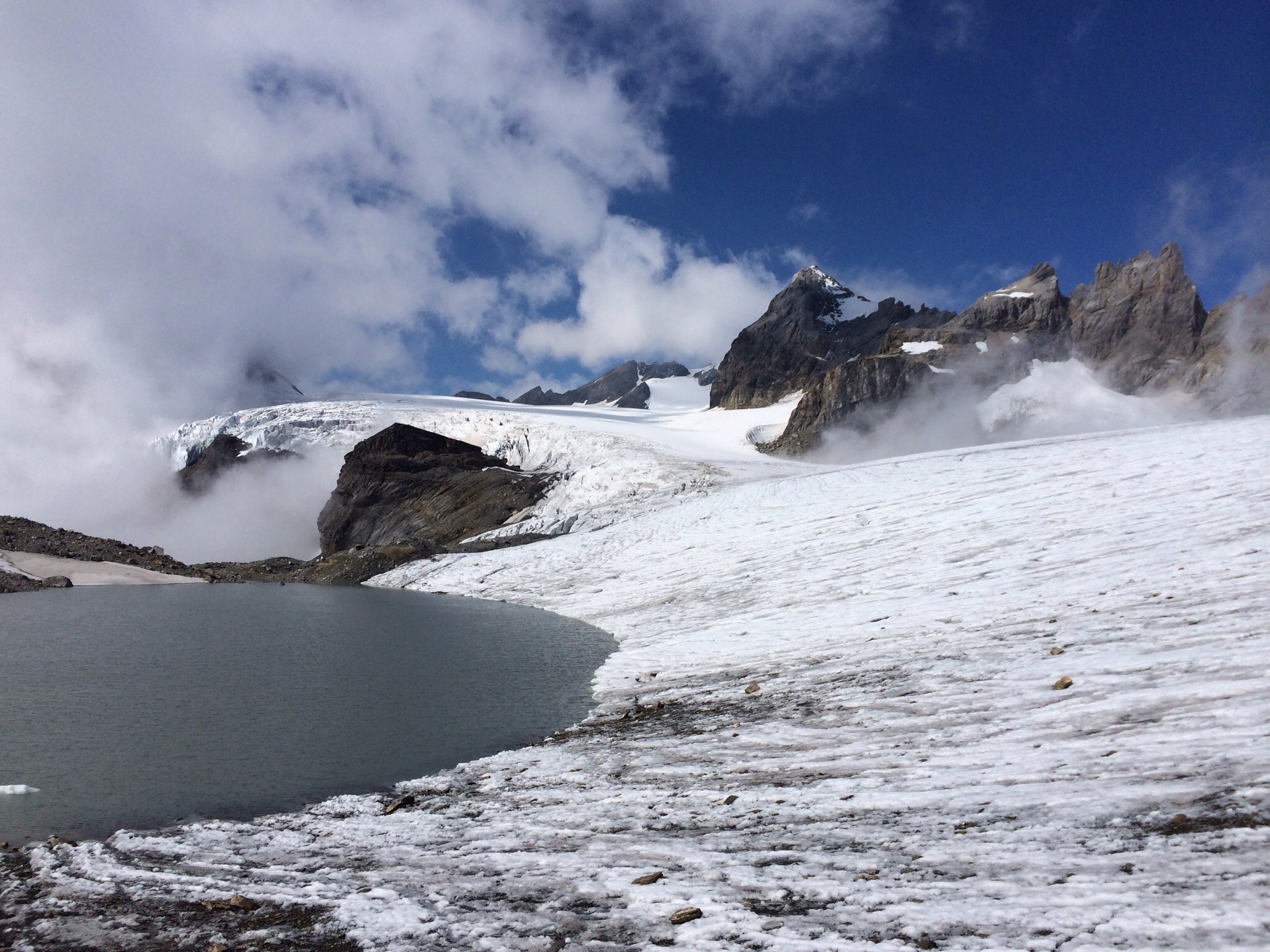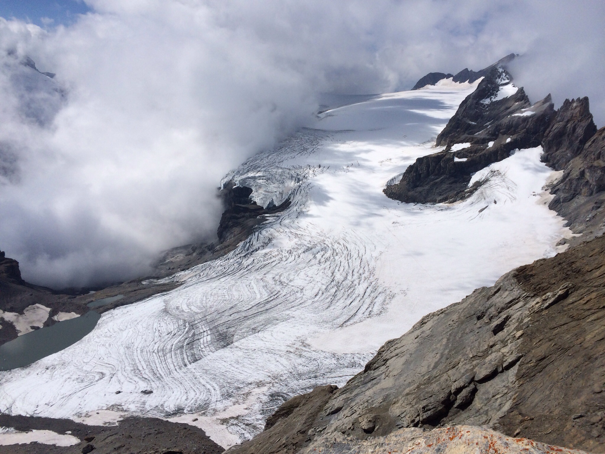 Wenige Hundert Meter weiter oben, wo unsere Route den Wanderweg verlässt und durch eine Moränenlandschaft an die Gletscherzunge des Claridenfirn führt, entscheiden wir uns für ein „Go“. Wir vertrauen darauf, dass der Wind die Oberhand behält und uns die Sicht zumindest für die nächste Stunde freihält, in der die Orientierung oberste Priorität hat. Beim Zungensee betreten wir den Gletscher und steigen zur Lücke hoch, der uns den Aufstieg auf den Gipfelgrat erlaubt. Hinter uns „kocht“ die Wolkendecke vor dem Tödi, immer wieder greifen wir zur Kamera, um diese Bilder festzuhalten. Die letzten Meter zur Lücke sind anstrengend, rund 50 Höhenmeter müssen durch einen äusserst steilen, rutschigen Schutthang bewältigt werden, die Schlüsselstelle der Tour.