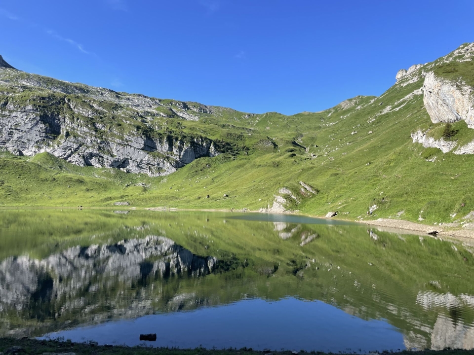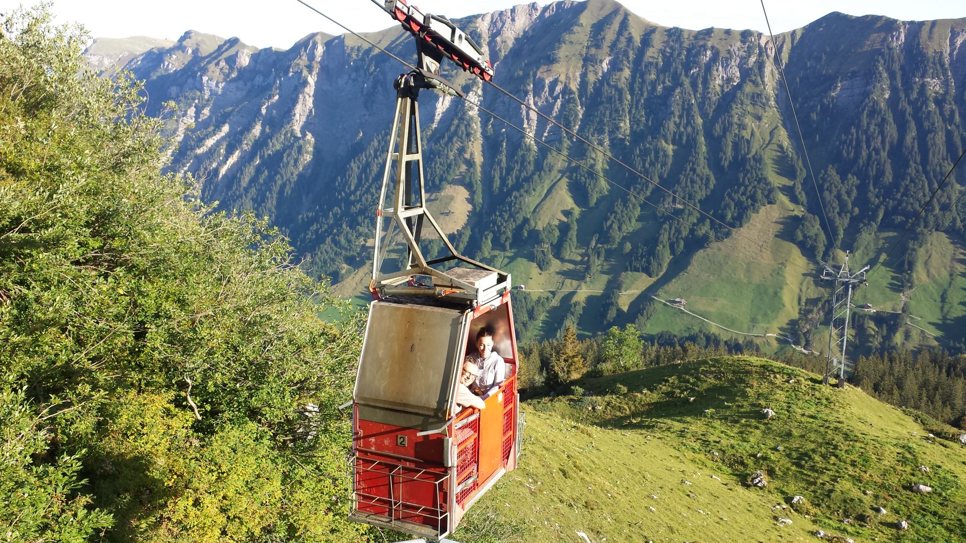 Kurz nach acht Uhr parkieren wir bei der Chäppeliberg-Bahn zuhinterst im Riemenstaldner Tal. Wir besteigen das rote Metallkistchen, das uns innert weniger Minuten in unser Wandergebiet hebt. Es ist luftig, der Boden ist ein Rost, man sieht direkt in den Abgrund. Das ist nicht für alle easy. Der Blick wendet sich deshalb schnell dem Urnersee zu, der am Talende türkisblau schimmert.