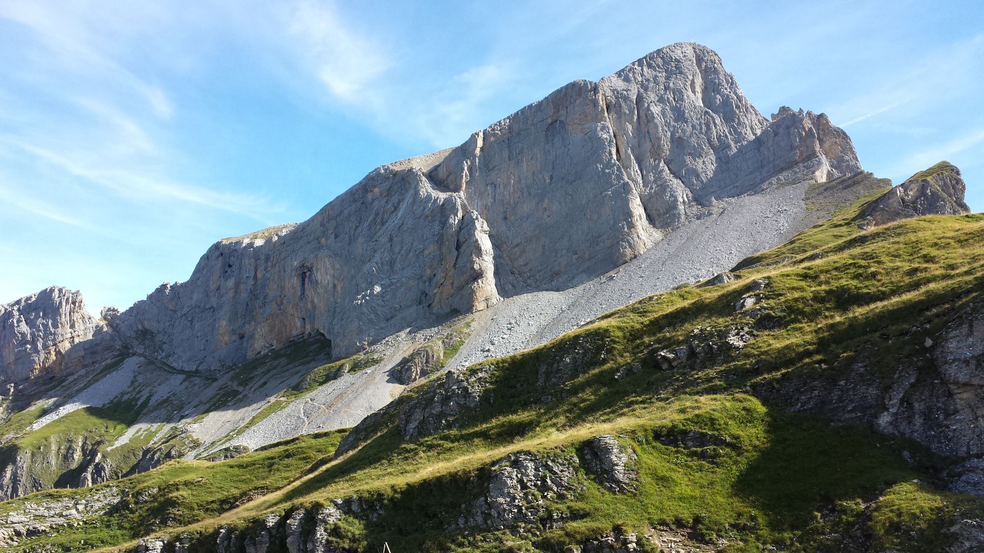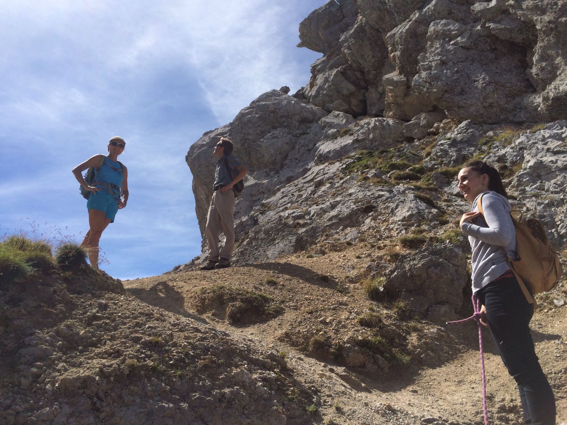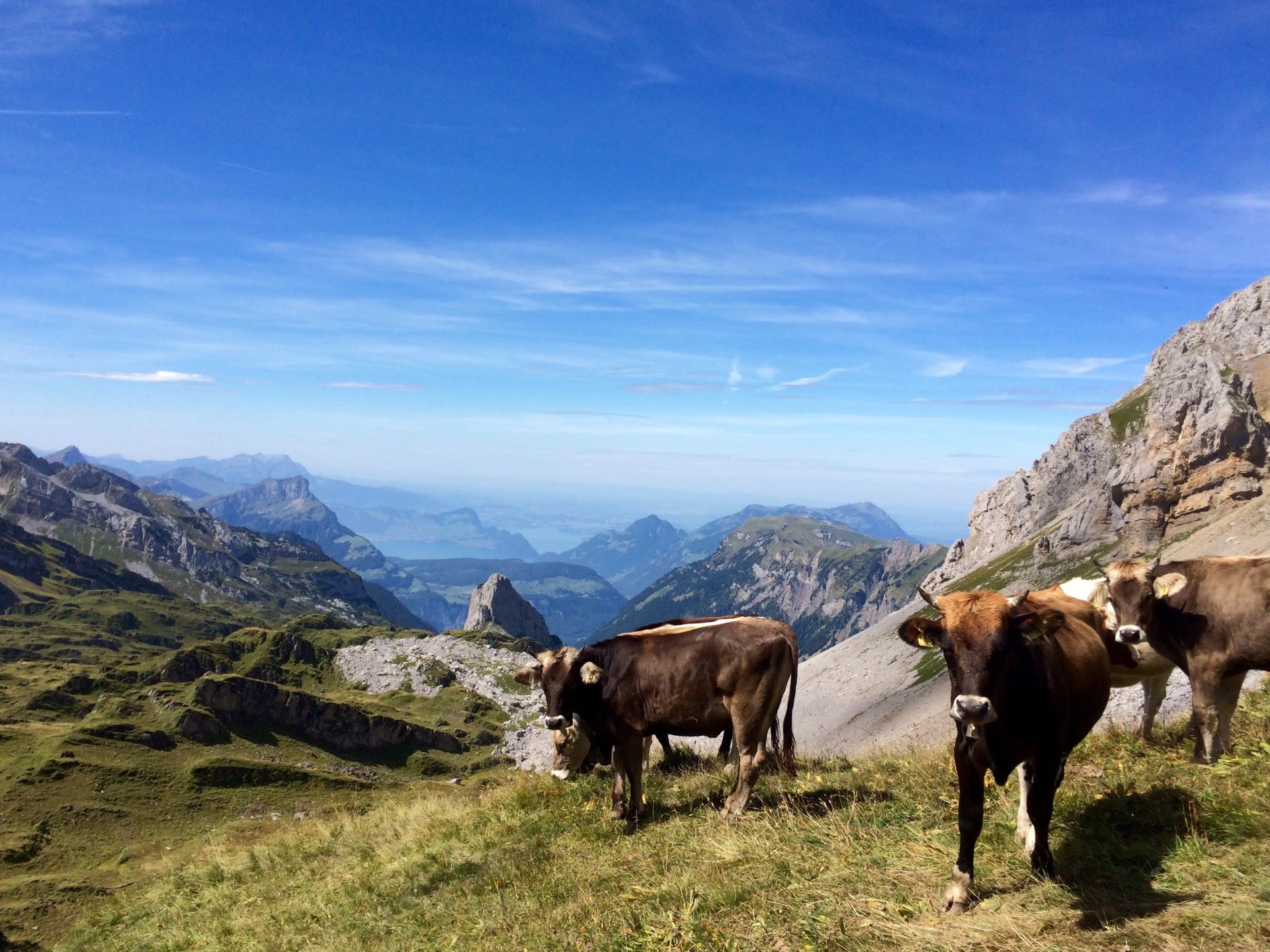 Beim Abstieg leisten die Schlingen und das Seil nochmals gute Dienste. Das Sichern kostet zwar etwas Zeit, dafür bleibt die Kraxelpartie bei allen in bester Erinnerung. Auf dem weiteren Abstieg können wir zunächst noch etwas schuttsurfen bevor wir wieder ins grüne Reich der Kühe zurückkommen, die uns herzlich begrüssen.