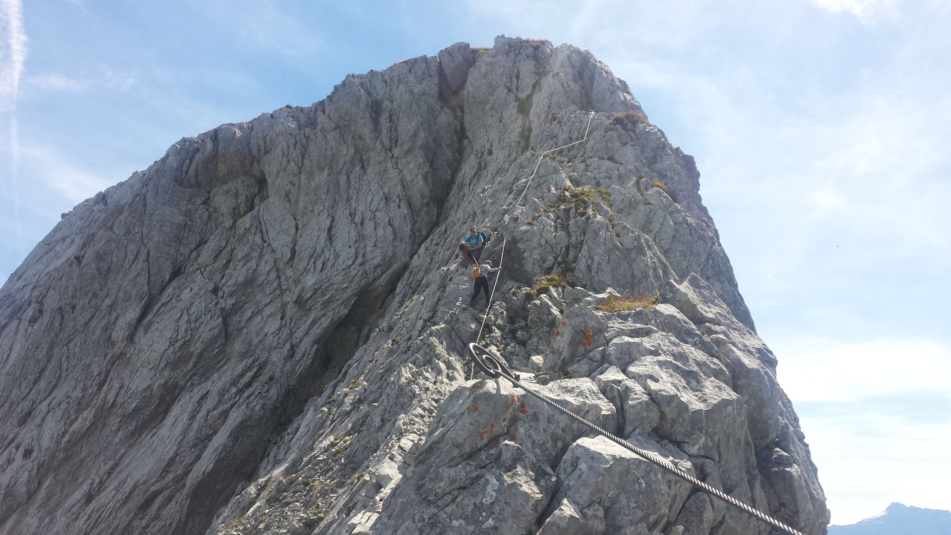 Mit einfachem Kraxeln gelangen wir auf den Grat. Pauline scheint erleichtert. „War das alles?“. „Es kommt noch etwas“, schmunzle ich und gehe voraus. Wir drehen um einen Gendarm, und dann beginnt die eigentliche Kraxlerei. Ein Stahlseil zeigt den Weg, und an diesem Ding hält man sich auch gerne fest. Zeitweise etwas ausgesetzt führt die Route zu einem Kamin, das mit einer grossgliedrigen Kette ausgestattet ist – die Schlüsselstelle der Tour (II). Ich biete den Damen an, sie zu sichern, was diese gerne in Anspruch nehmen. Es gibt ein gutes Gefühl, wirklich brauchen tun sie es nicht, beide klettern stil- und genussvoll hoch.