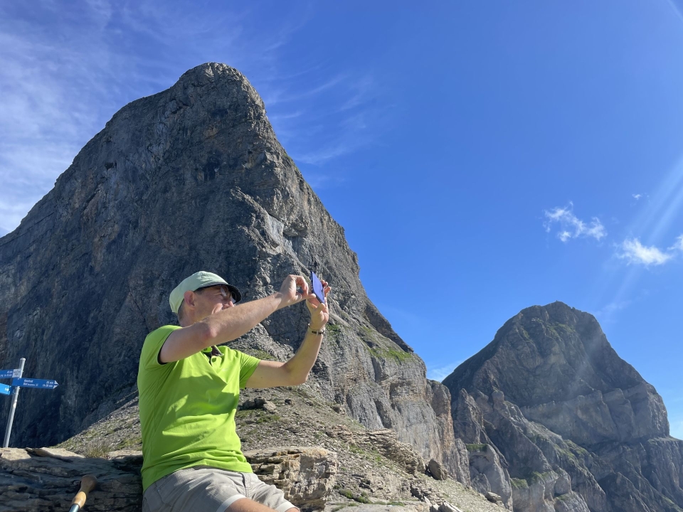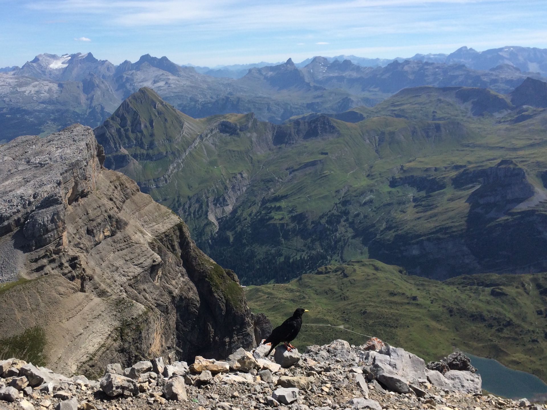 Über ein breites, steiles Schuttfeld, das nochmals etwas Kraft und Schweiss kostet, erreichen wir eine Viertelstunde später – und kaum zweieinhalb Stunden nach dem Start – den grosszügigen Gipfel des komplett freistehenden Chaiserstocks. Die Prinzessin hat sichtlich Freude, ihr Gefolge auch. Die Sicht ist klar wie an einem Herbsttag. Wir sehen Säntis, Glärnisch, Tödi, Titlis, Eiger, Mönch und Finsteraarhorn genauso scharf wie die Kappelibrücke in Luzern und das Seebecken von Zürich. Als wir uns an den Verzehr des mitgebrachten Proviants machen, bringen sich gleich mehrere gefrässige Dohlen in Stellung. Robin macht derweilen die Fotos für ihren Blogbeitrag, schliesslich will sie die schwere Canon nicht umsonst hochgeschleppt haben.