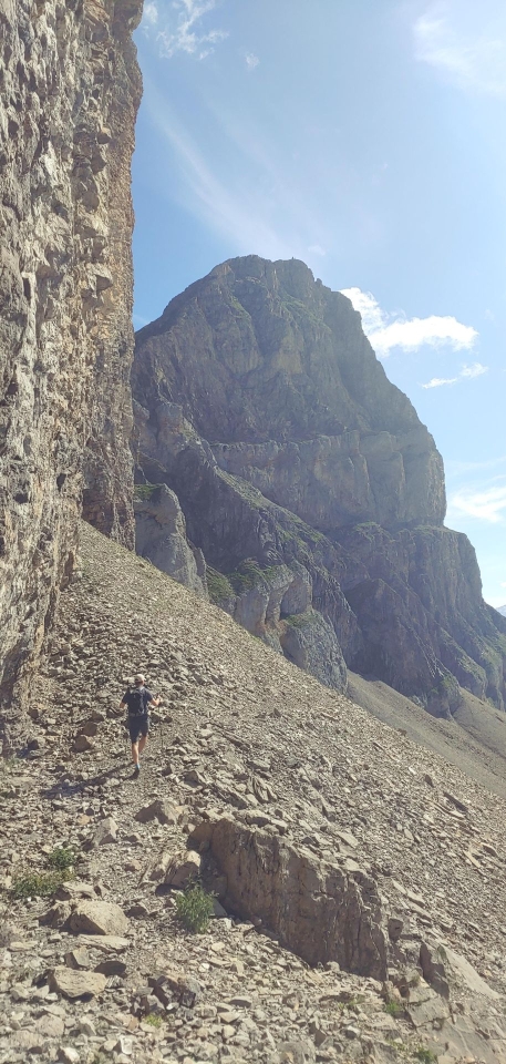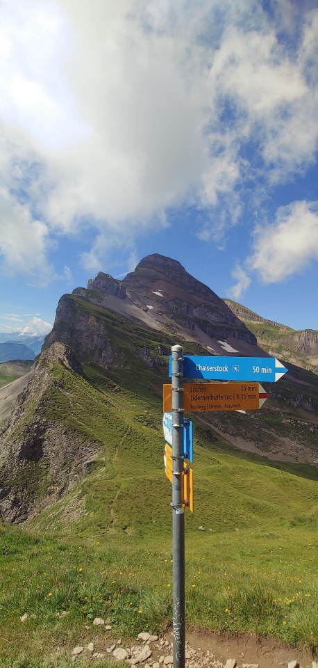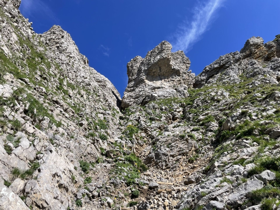 Jetzt wechselt die Markierung von rot-weiss auf blau-weiss. Zu Recht, schon die erste Überwindung eines kleines Felsbandes verlangt Trittsicherheit und gibt den Tarif durch. Wir queren unter der fast senkrechten Westwand des Chaiserstocks bis zum Fuss des Chaisertors. Ein kleiner Einschnitt, eine zufällige Laune der Natur, erlaubt hier den Aufstieg auf den Grat dieses grossartigen Gesteins und macht ihn zum Wanderberg.