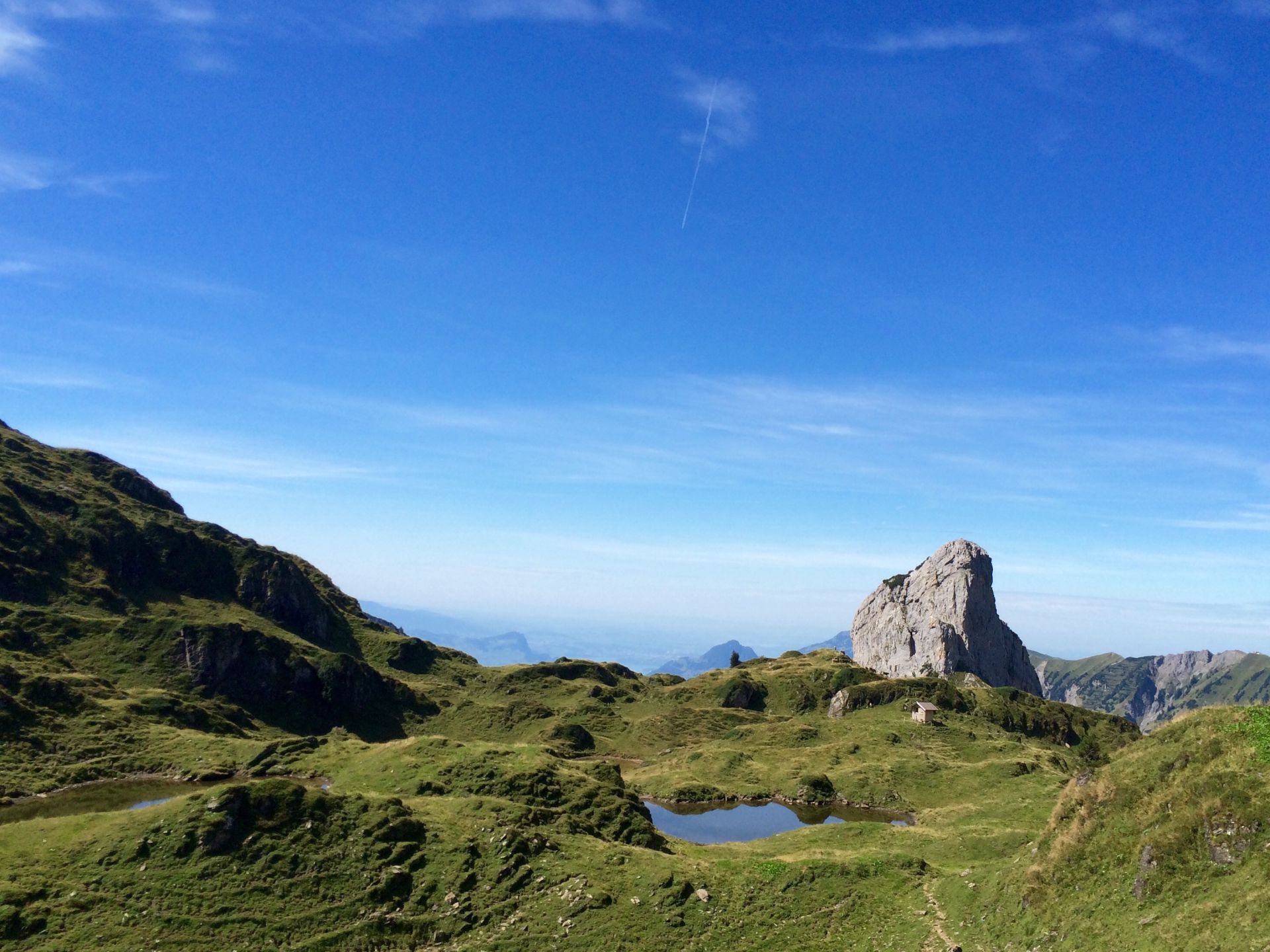 Wir wandern los und sind bald alleine. Ein paar junge Geisslein kreuzen unseren Weg, sie erhaschen sich etwas Aufmerksamkeit. Der Pfad führt grundsätzlich wenig steil steigend durch eine labyrinth-ähnliche Landschaft. Kleine Tümpel säumen den Weg, von hie und da ertönen Kuhglocken. Viel Rittersporn steht Spalier für die Prinzessin. Diese meint, die zerklüftete Landschaft erinnere sie an Island. Da muss ich also auch einmal hin. Vor uns baut sich im Gegenlicht der Morgensonne der Chaiserstock auf, seine abweisenden Wände lassen bei meinen Begleitern Fragezeichen aufkommen, wie man da hoch kommen soll.
