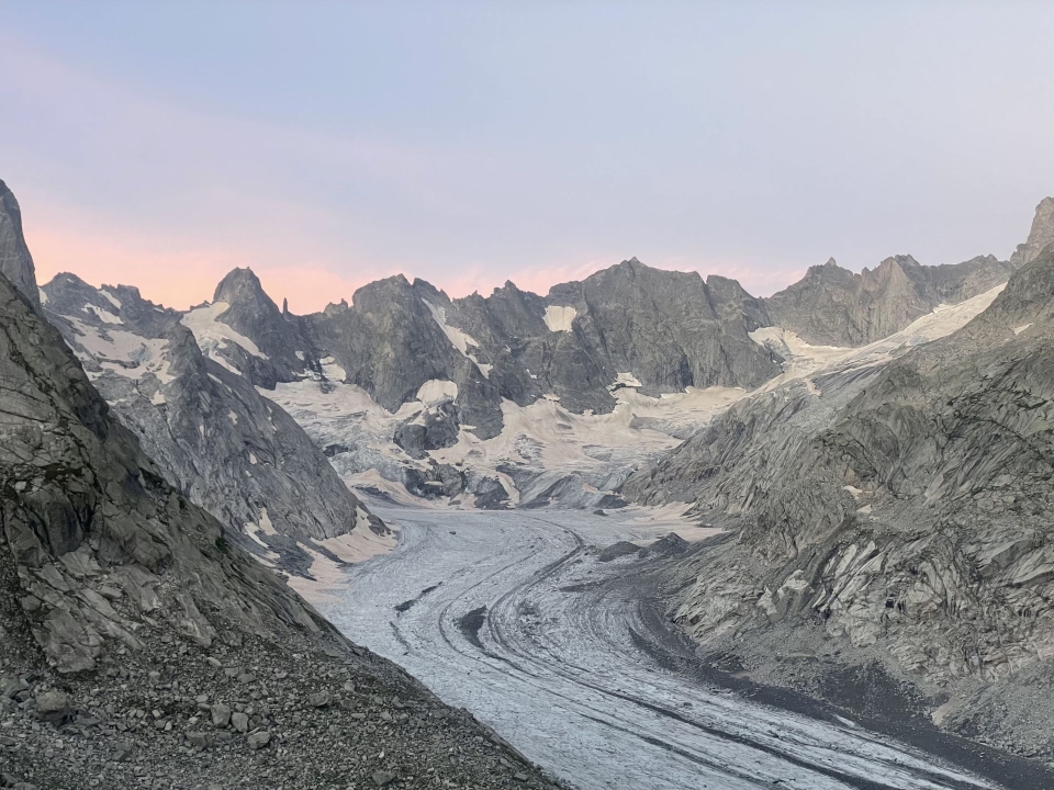 Nach einer guten Nacht im Doppelzimmer der Fornohütte begrüsst uns der Bergmorgen in seiner vollen Pracht. Das Panorama auf Fornogletscher und Torronegruppe ist phänomenal. Das Morgenrot ziseliert einen märchenhaften Zauber auf unsere Netzhaut. Perfekt!
