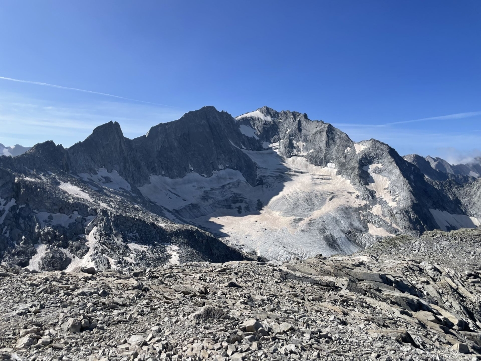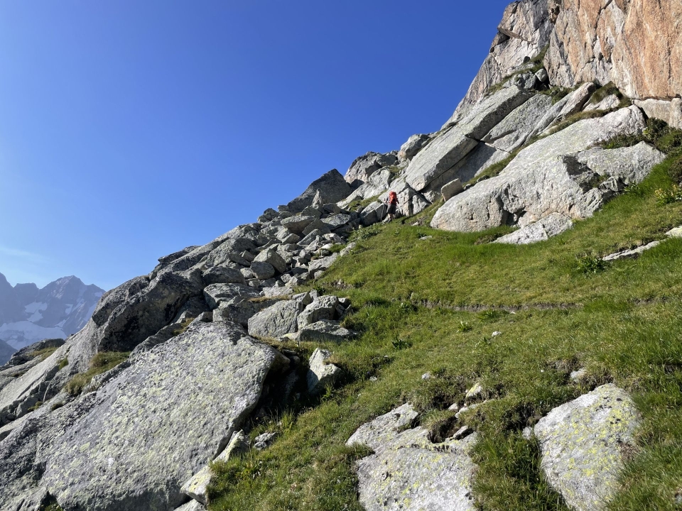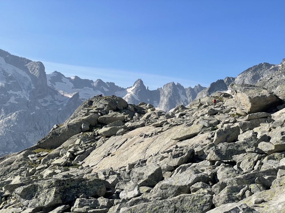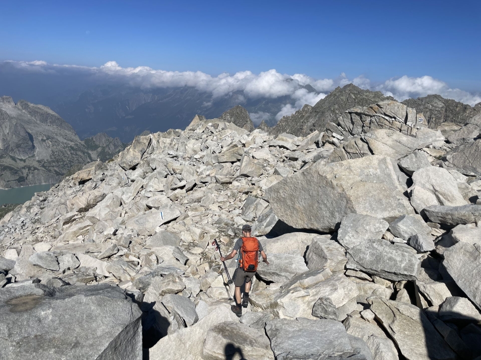 Knapp über 2650m Höhe flacht es kurz ab. Wir betreten einen Blockboden, der einen herrschaftlichen Blick auf die Berg- und Gletscher-Granden des Val Forno bietet. Der perfekte Moment für eine (Foto)-Pause und einen Blick übers Tal zur Hütte, die wir vor zwei Stunden verlassen haben. Auch der Monte del Forno grüsst jetzt freundlich, den wir gestern nur in und aus den Wolken gesehen haben.