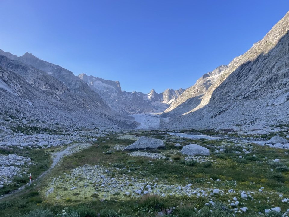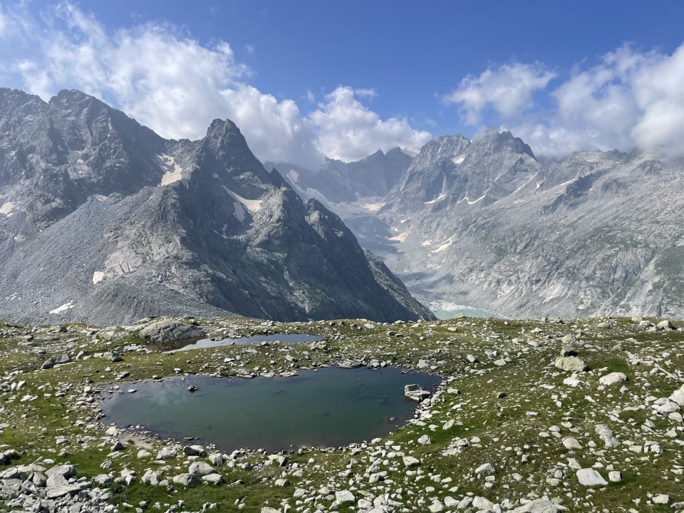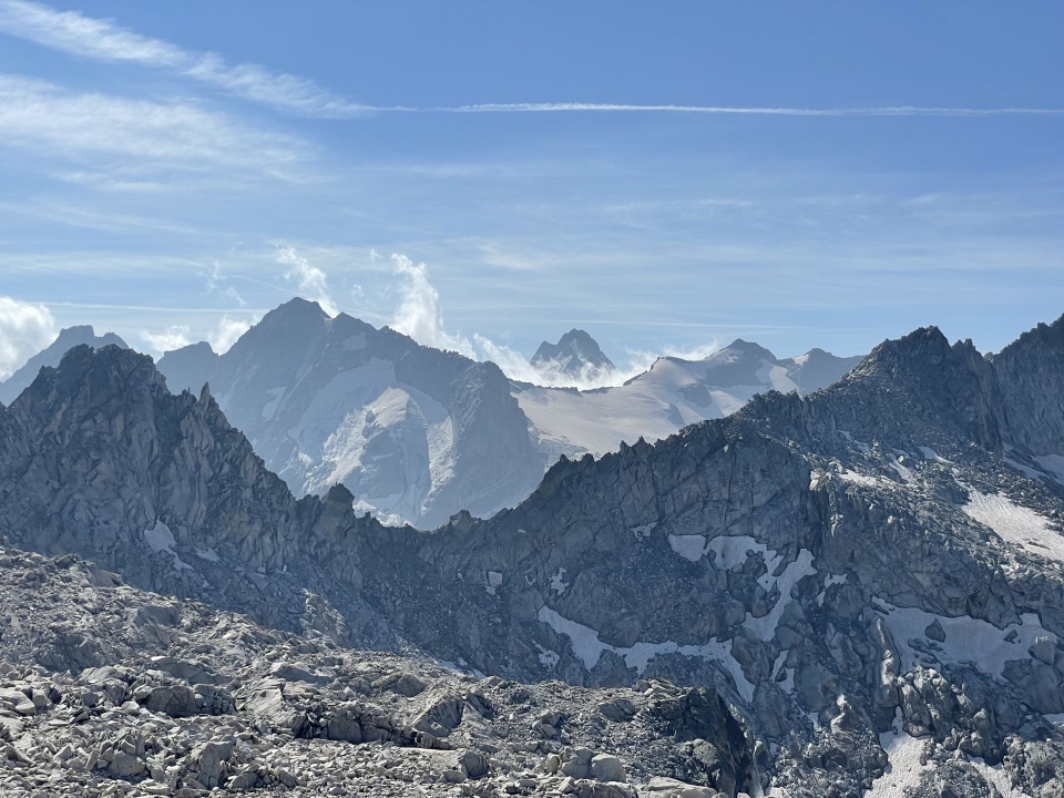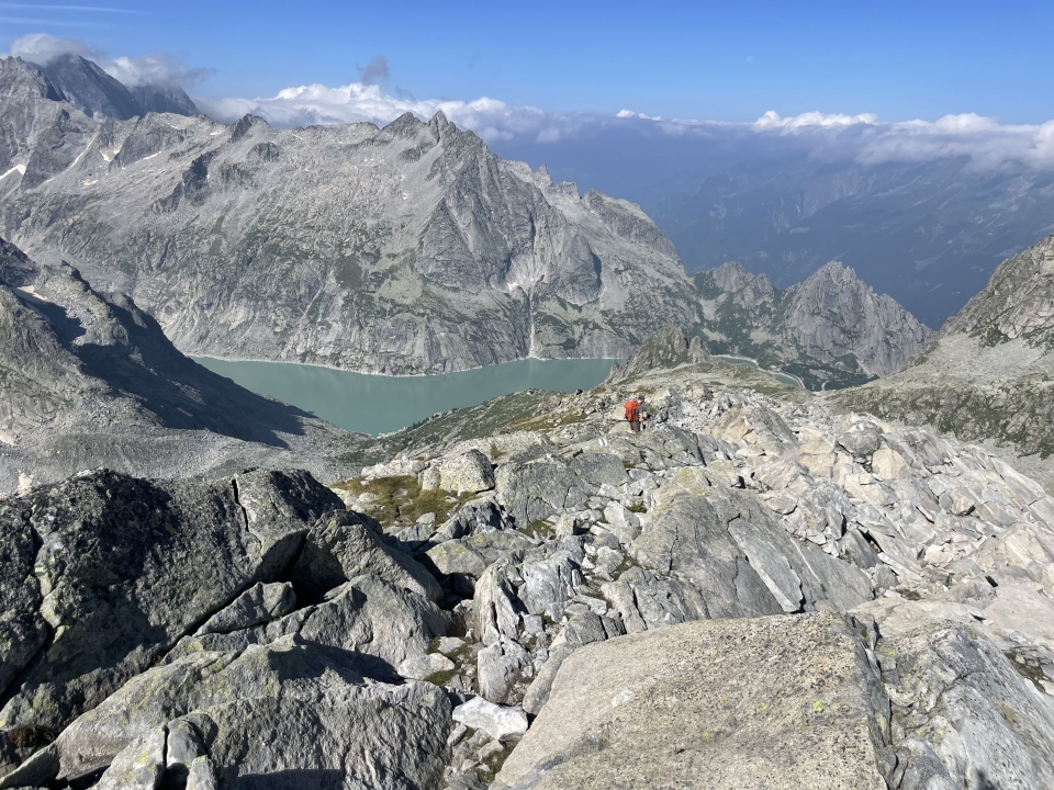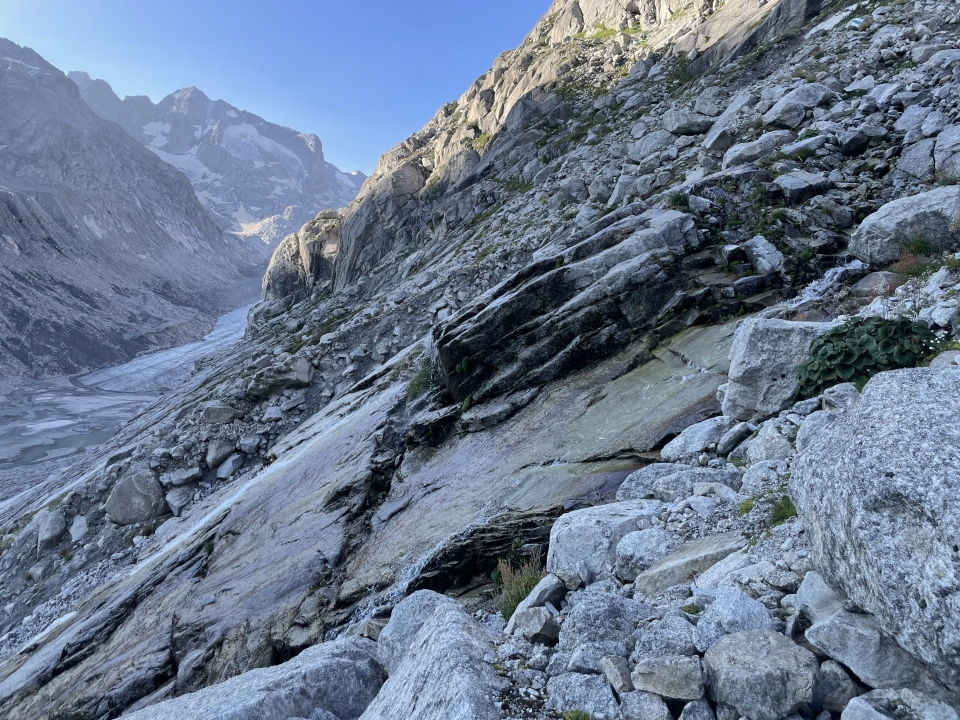 Knapp über 2650m Höhe flacht es kurz ab. Wir betreten einen Blockboden, der einen herrschaftlichen Blick auf die Berg- und Gletscher-Granden des Val Forno bietet. Der perfekte Moment für eine (Foto)-Pause und einen Blick übers Tal zur Hütte, die wir vor zwei Stunden verlassen haben. Auch der Monte del Forno grüsst jetzt freundlich, den wir gestern nur in und aus den Wolken gesehen haben.