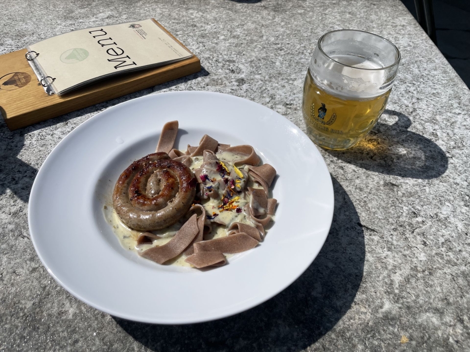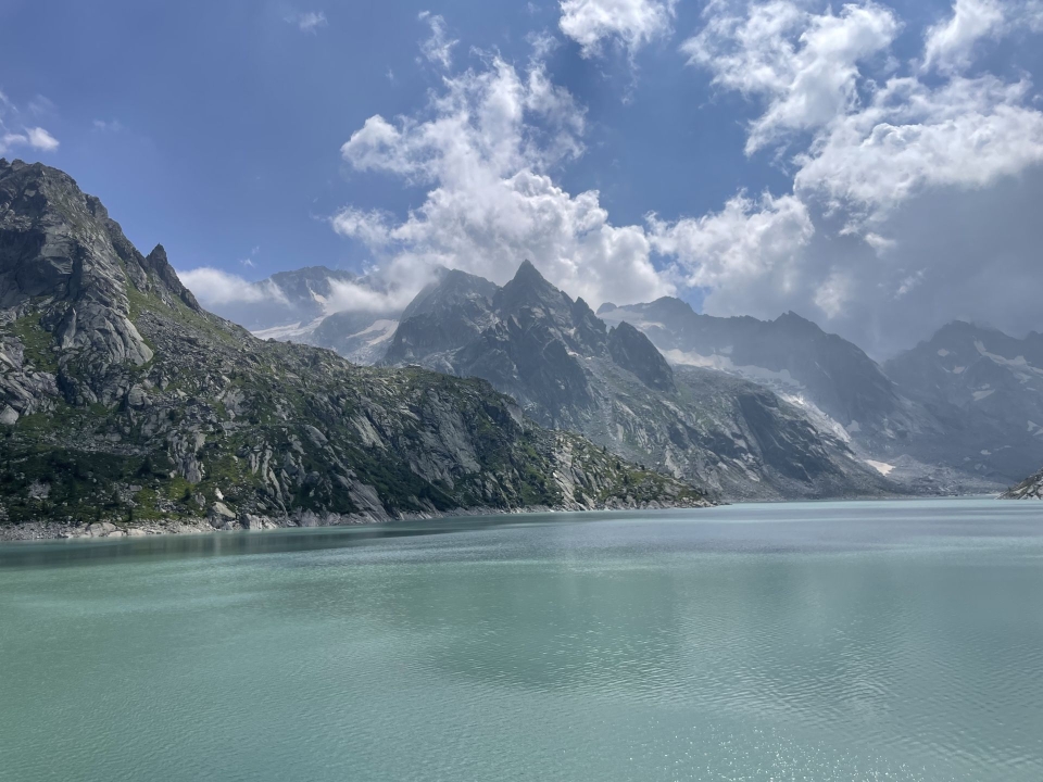 Dafür begrüssen uns hier die Murmeli, und wenig später erreichen wir die Albignahütte. Diese liegt neckisch über dem Albignastausee mit grossartigem Blick auf die Gletscher. Wir haben jetzt Hunger und Durst – und dafür bietet die Hütte beste Therapien! So verschlingen wir zuerst eine Portion Tagliatelle di Castagna mit einer feinen Schweinswurst und dann gleich noch ein grosses Stück Aprikosenwähe obendrauf. Wunderbar!