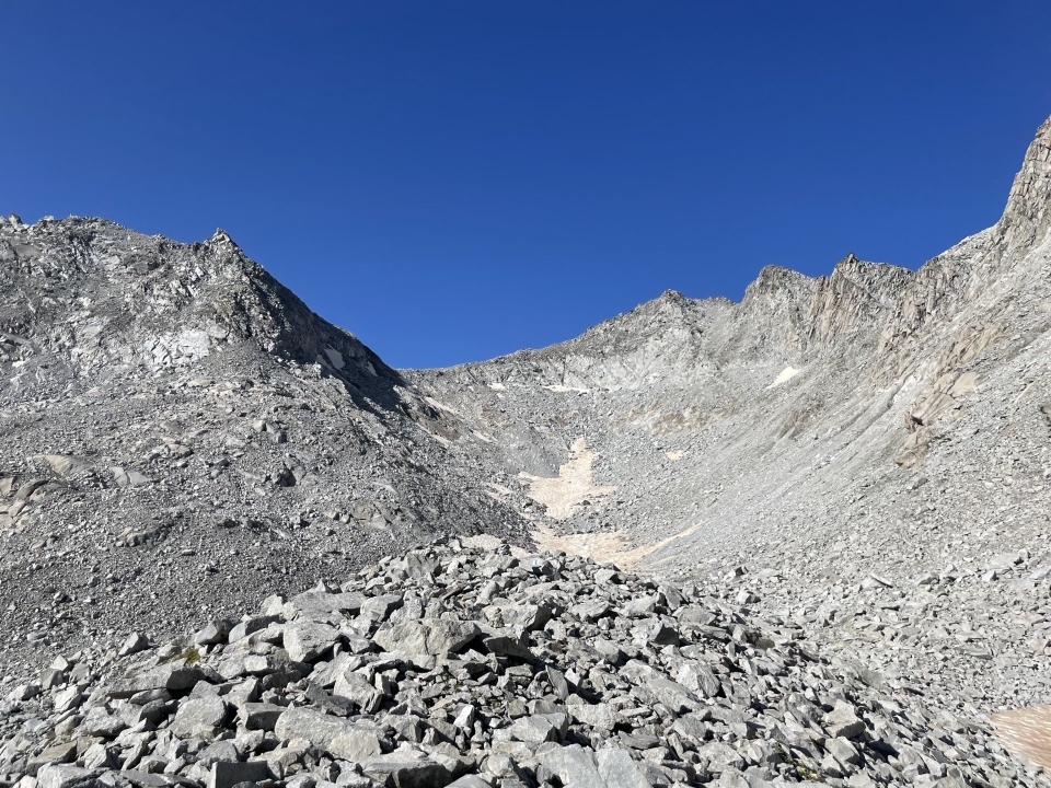 Die Route wechselt jetzt wieder in den Steigmodus. Bald helfen uns wertvolle Ketten zur Überwindung eines steilen Grabens. Danach wird es einfacher, aber nicht weniger anstrengend. Über die Blöcke der Endmoräne eines verschwundenen Gletschers erreichen wir einen Talkessel unterhalb des Passes – und nach einigen Schweisstropfen mehr dessen Scheitelhöhe. Geschafft! Das waren anspruchsvolle 700 Höhenmeter!