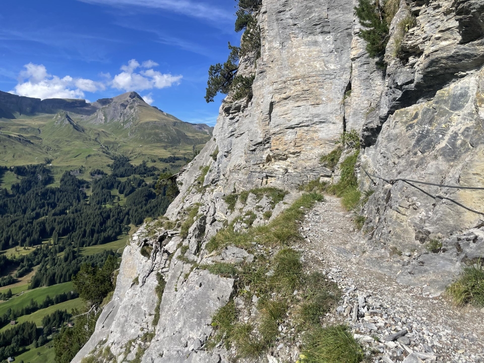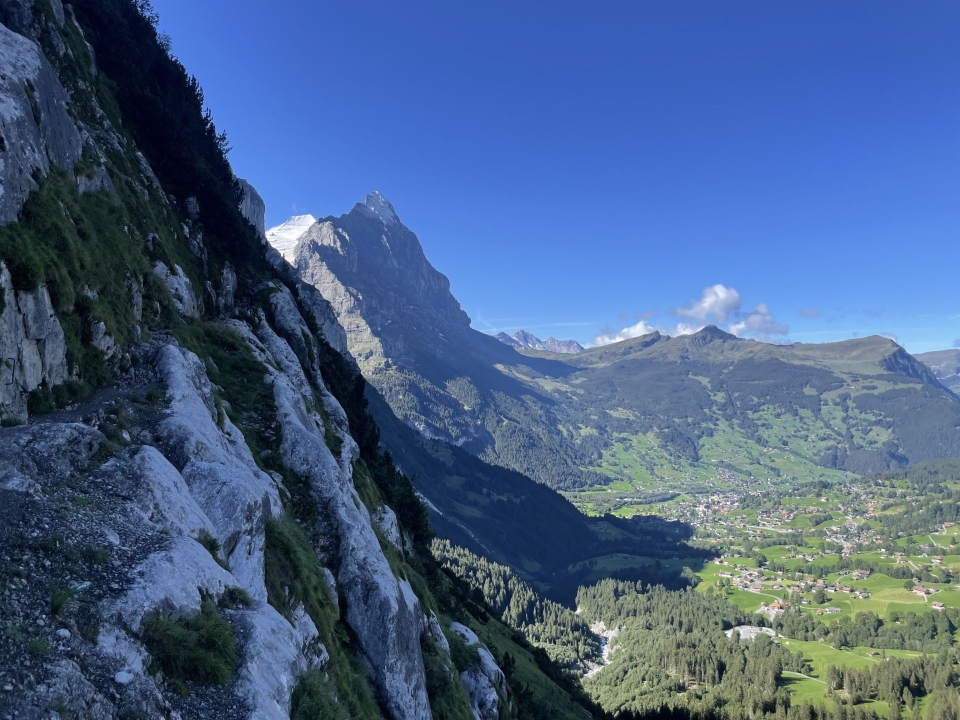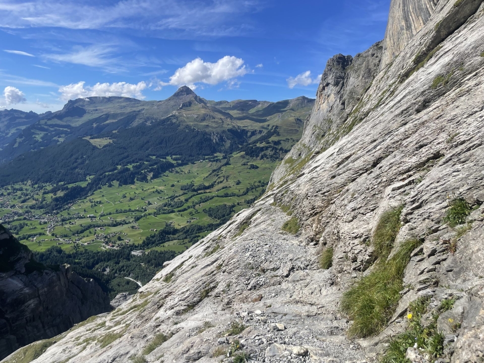Beim Ischbeizli sieht der Ischpfad wie ein Faden in der Wetterhornwand aus (links der Mitte der Baumkrone)