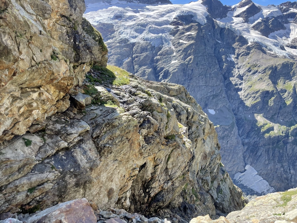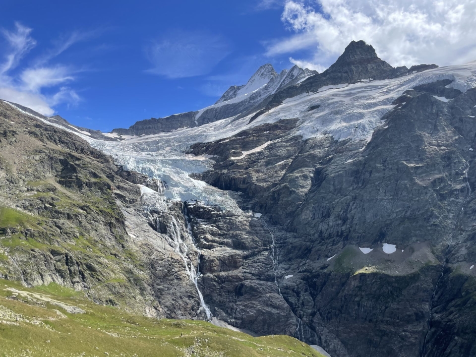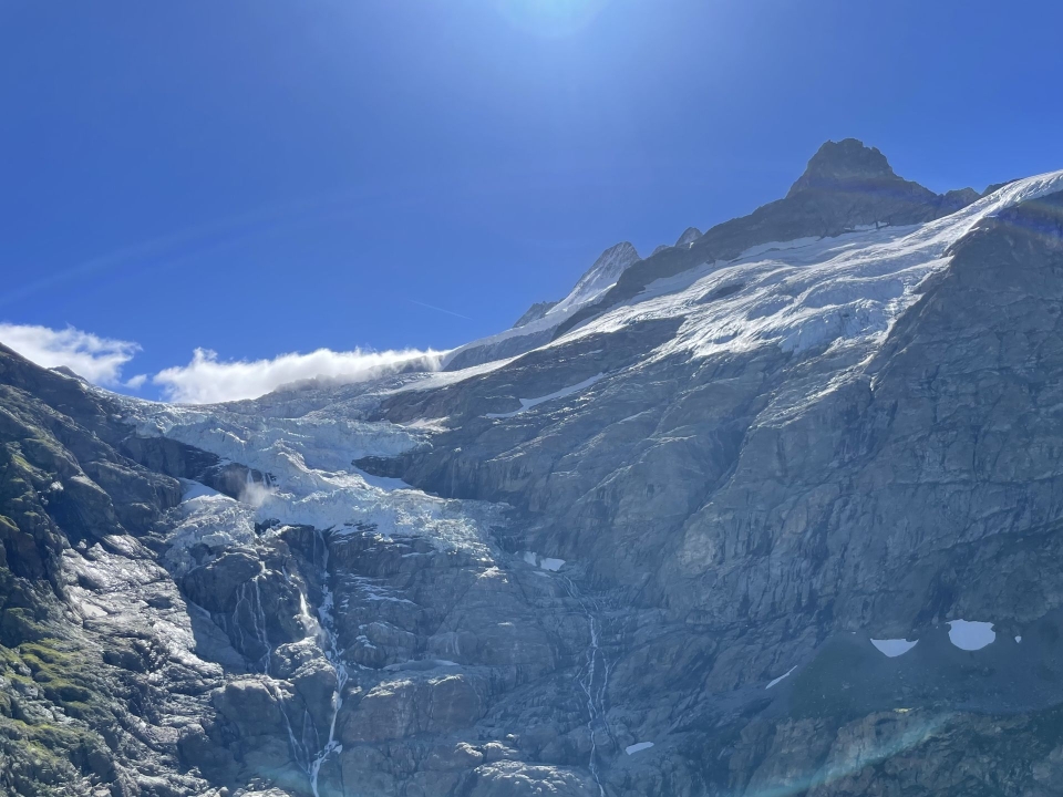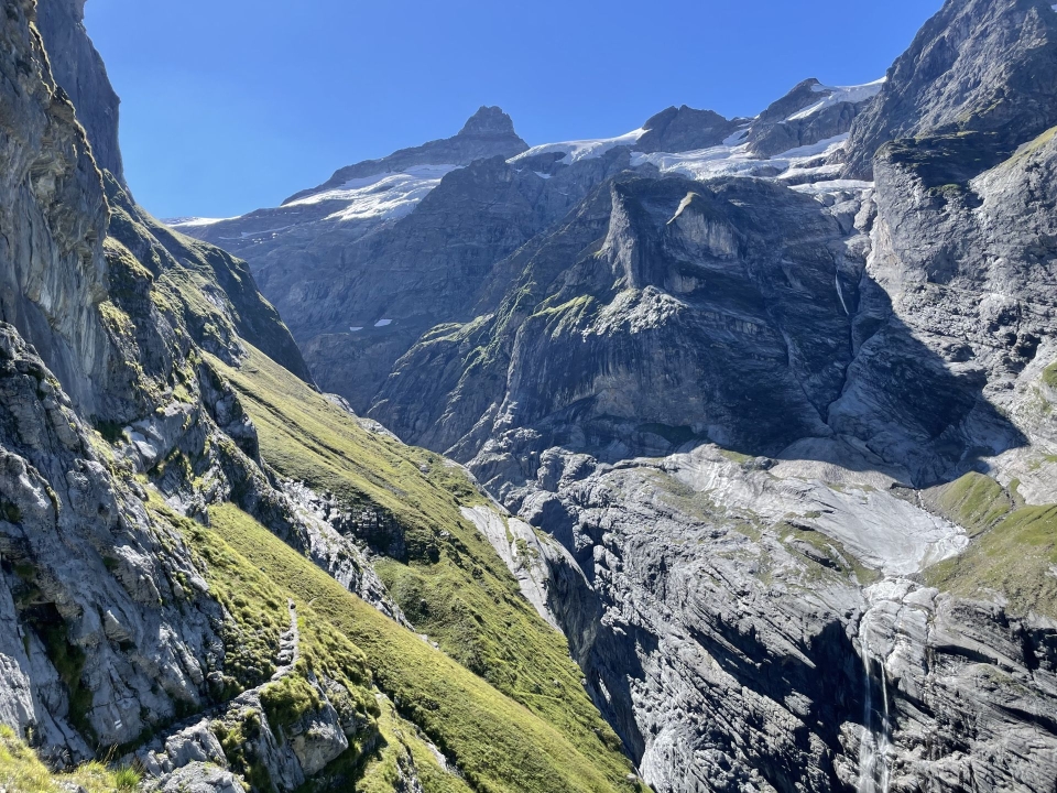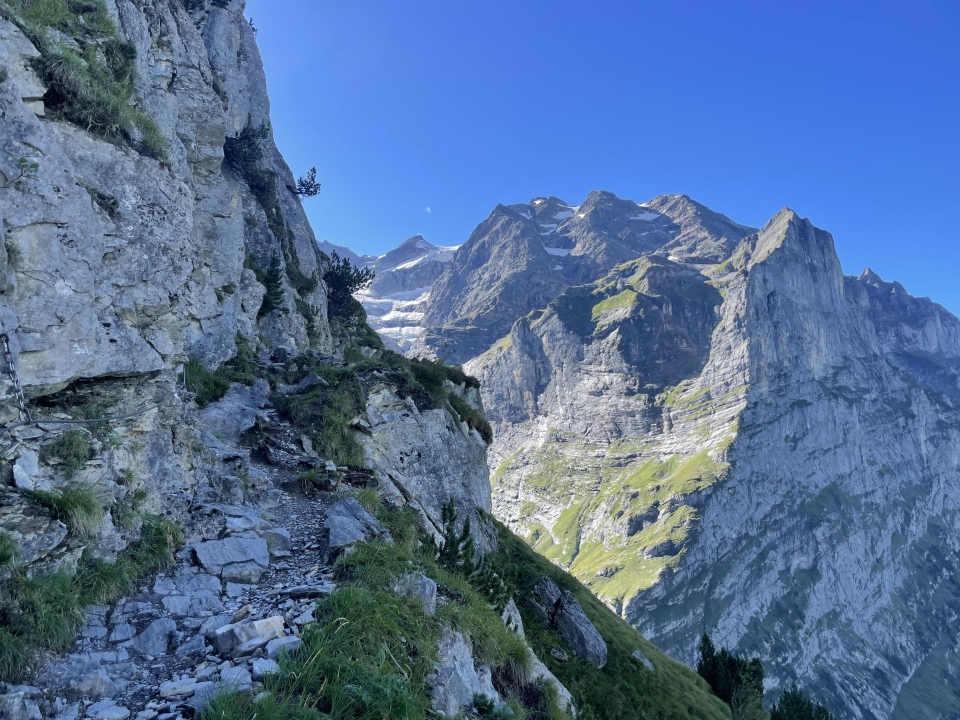Zurück zur Tour: Der Pfad ist jetzt weniger ausgesetzt wie auf dem Ischweg. Der Blick hinunter in die tiefe Schlucht, wo die Toteisreste der alten Gletscherzunge liegen, ist dennoch nichts für schwache Nerven. Lieber richte ich meine Augen etwas sehnsüchtig auf das Schreckhorn (bleibt wohl für immer auf meine Bucketliste) und die blauglänzenden Türme des Gletscherfalls hoch über mir. Derweilen staune ich, wie aufwendig und kunstvoll der schmale Weg aus den Felsen geschlagen wurde. Er ist wesentlich einfacher geworden (nie über T3) als früher – aber nicht weniger spektakulär! Ich bin froh drum.