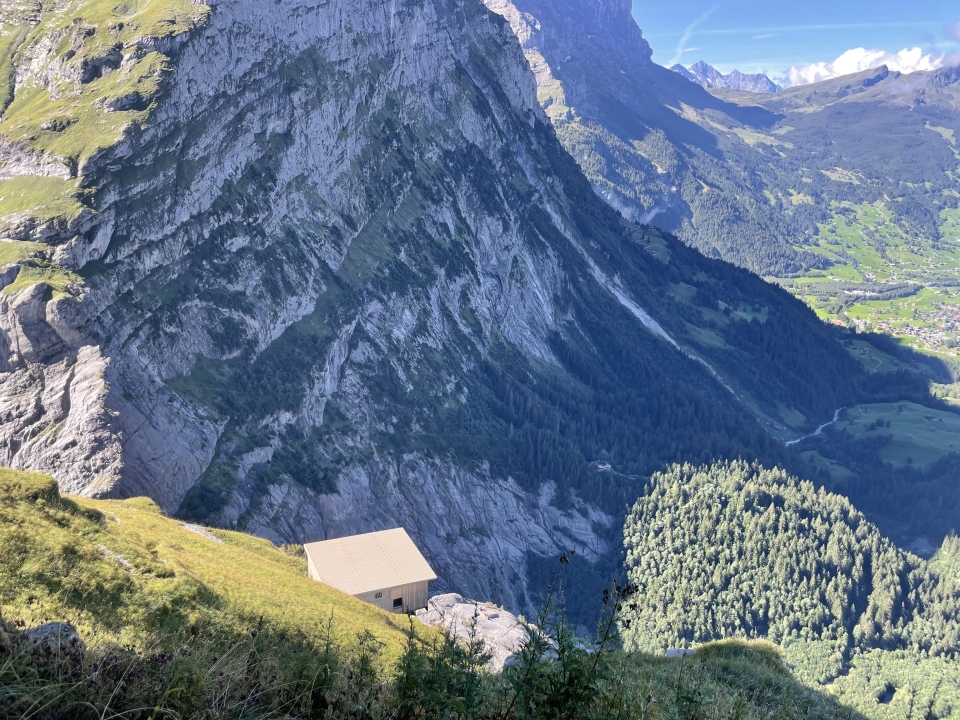 Nach einer halben Stunde Kribbel-Genuss erreiche ich die Bergkante oberhalb der alten Bergstation „Enge“ des Wetterhornaufzugs, hier dreht der Pfad ins Gletschertal. Es bleibt wieder etwas Zeit für Nostalgie: Die Bahn wurde 1908 als erste Luftseilbahn der Schweiz eröffnet. Die Vision des Gründers war, mit drei weiteren Sektionen auf das Wetterhorn zu gelangen. Doch dann kam der Krieg, die Touristen blieben aus und das kühne Werk wurde 1915 für immer stillgelegt. Immerhin hat man die exponierte Bergstation vor einigen Jahren ein bisschen restauriert, sonst wäre dieser Zeitzeuge wahrscheinlich längst von der Felskante ins Tal gedonnert.