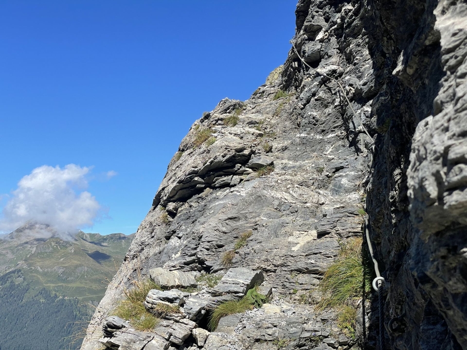 Mit 14 bin ich hier zusammen mit meiner Schwester (12) und meinem Vater zum ersten Mal hoch. Er muss ein Urvertrauen in uns gehabt haben – oder er wusste es einfach noch nicht besser, hatte doch auch er nur gerade ein Jahr mehr Bergerfahrung als wir Kids. Die Website der Hütte empfiehlt, Kinder unter 10 ans Seil zu nehmen… aber seht selbst – es braucht trotz der vielen Stahlseile etwas Mut.