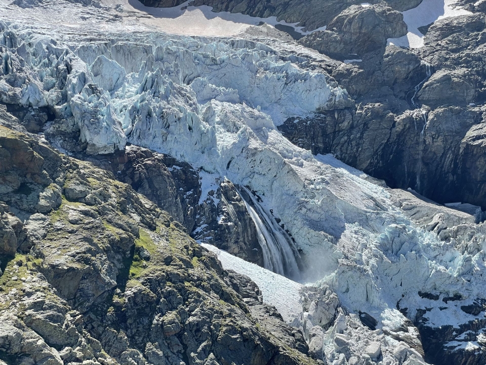 Ich kriege wohl nie genug von diesen Eisfällen mit ihren Seracs, dem Tosen des Wassers unter dem Eis und den skurrilen Spalten und Drehungen dieser Eispanzer. Heute spielt der Wind noch mit ein paar Wolken, die die Szenerie noch gewaltiger erscheinen lassen. Ein Traum. Es berührt mich tief, ich spüre mein Augenwasser. Der Wind lässt es leise trocknen.