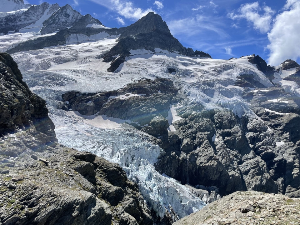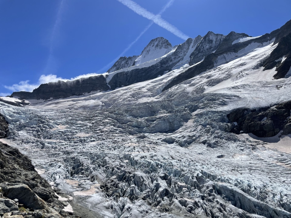 Aussicht von der Hüttenterasse. Das Beesebärgli ist links oben wo der Gletscher flacher wird.