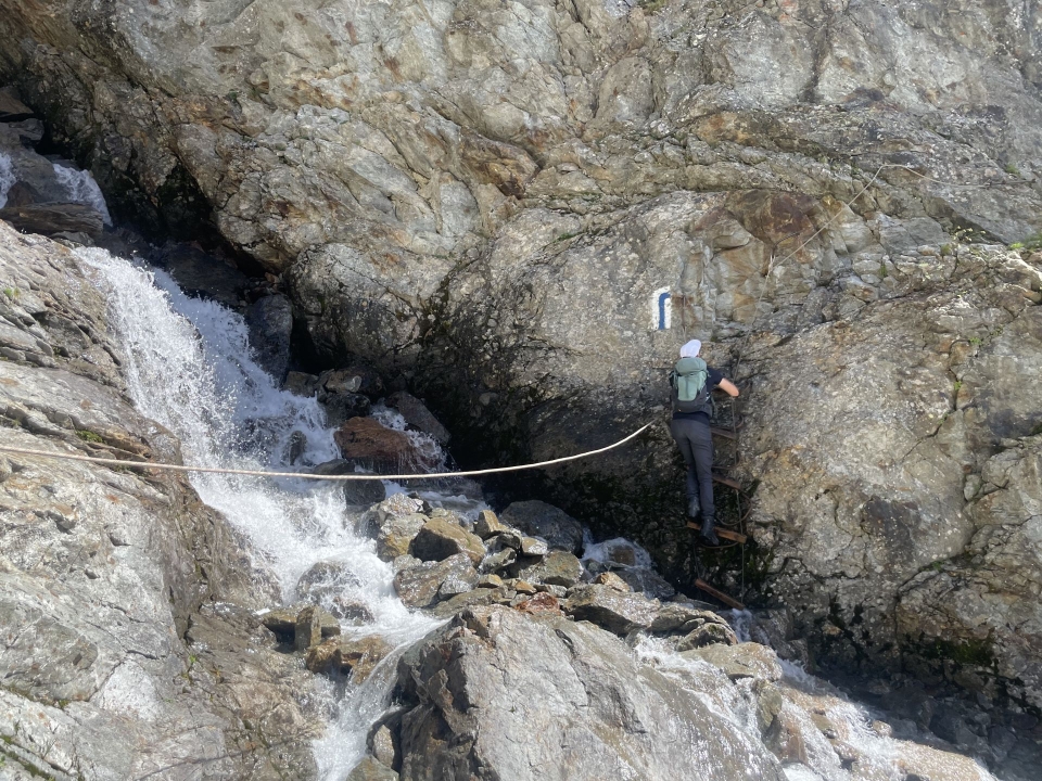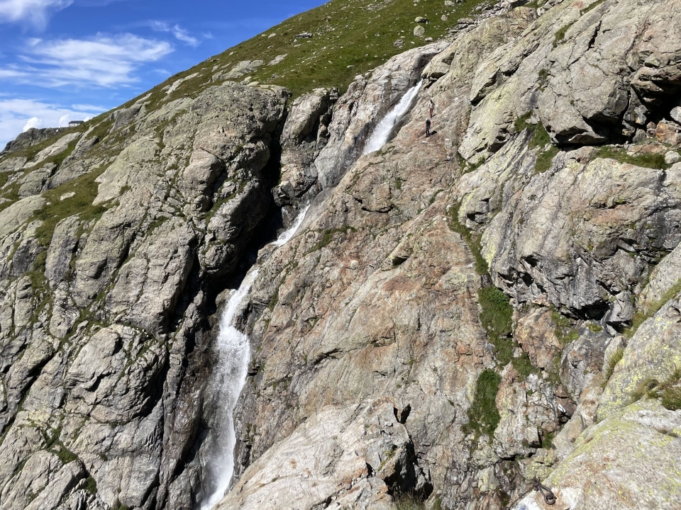 Nach einem herzhaften Glücksseufzer mache ich mich etwas unwillig auf den Abstieg und wähle diesmal die untere Route. Sie ist wesentlich einfacher als die obere, mit einer Ausnahme: die Bachtraversierung und eine 50 Meter Wand. Hier hat ein früherer Hüttenwart ein echtes Kunststück vollbracht. Eine Kombination von Tritten, Stahlsprossen, einer Strickleiter, einem Seil über den einen Bach und einem Brücklein über den anderen. Das ist echt cool – und nochmals ein kleines Abenteuer für Bergjunkies.
