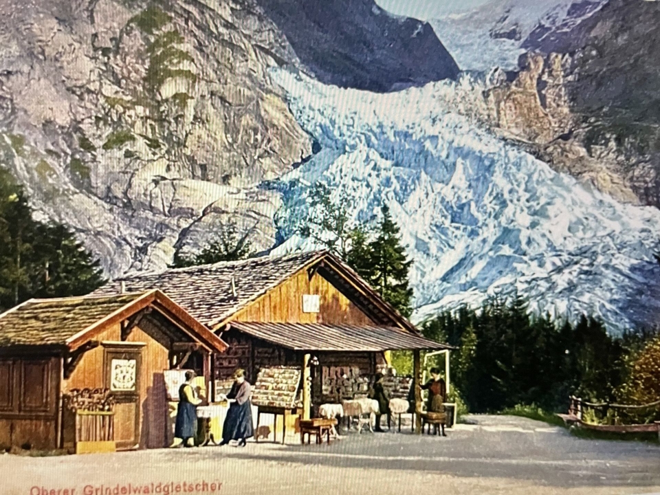 Eine alte Postkarte mit dem Zutrittshäuschen zum Gletscher beim Hotel Wetterhorn