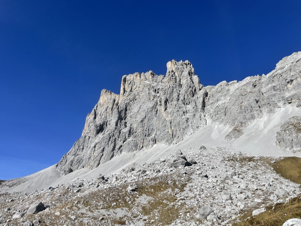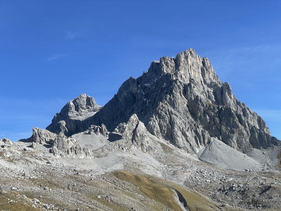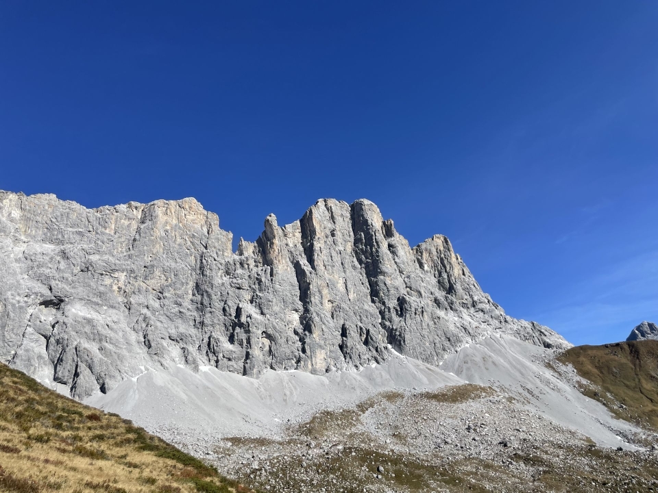 Es zieht sich zu dieser Hütte, aber die Aussicht auf die unwegsamen, rohen Wände der Drusenfluh ist spektakulär. Es bröckelt auch immer mal wieder. Das dumpfe Echo der fallenden Steine prägt sich nachhaltig in mein Tour-Gedächtnis ein. Natürlich habe ich auch Freude an der fantastischen Weitsicht in die Bündner Bergwelt, aber mein Fokus liegt heute eindeutig auf diesen Kalkriesen. Nach der Drusenfluh kommt die Sulzfluh mit ihren bizarren Zacken, Zähnen und Türmen. Grossartig! Wie gerne denke ich an die Klettersteigtour mit Lea zurück, die mich vor 11 Jahren letztmals auf diese Steinfestung führte! Und ja: Natürlich werde ich in Partnun wieder ein Trotti nach St. Antönien nehmen. Es kommt Vorfreude auf!