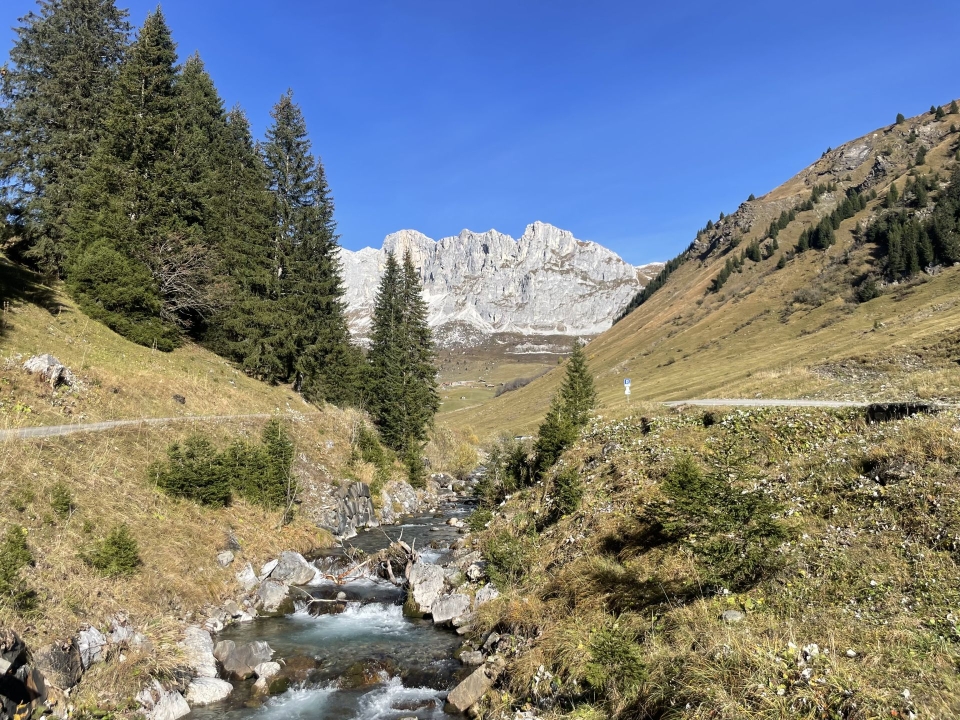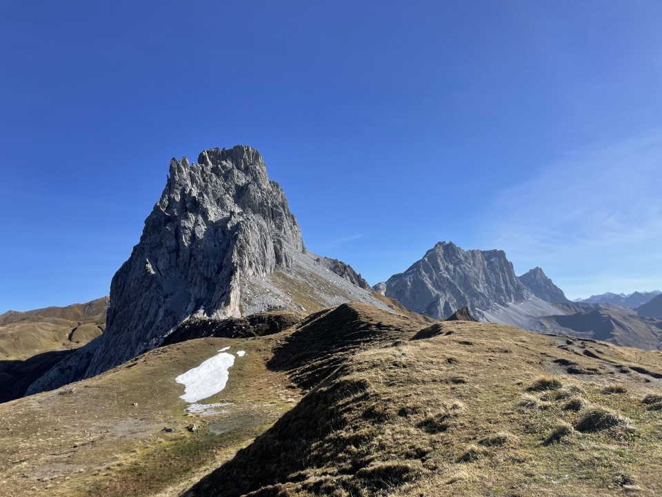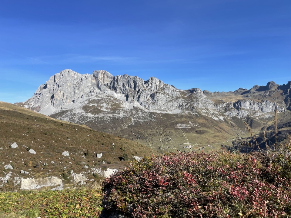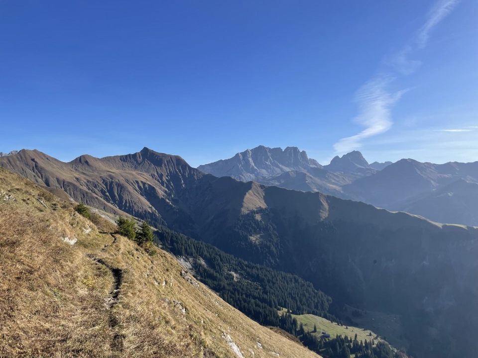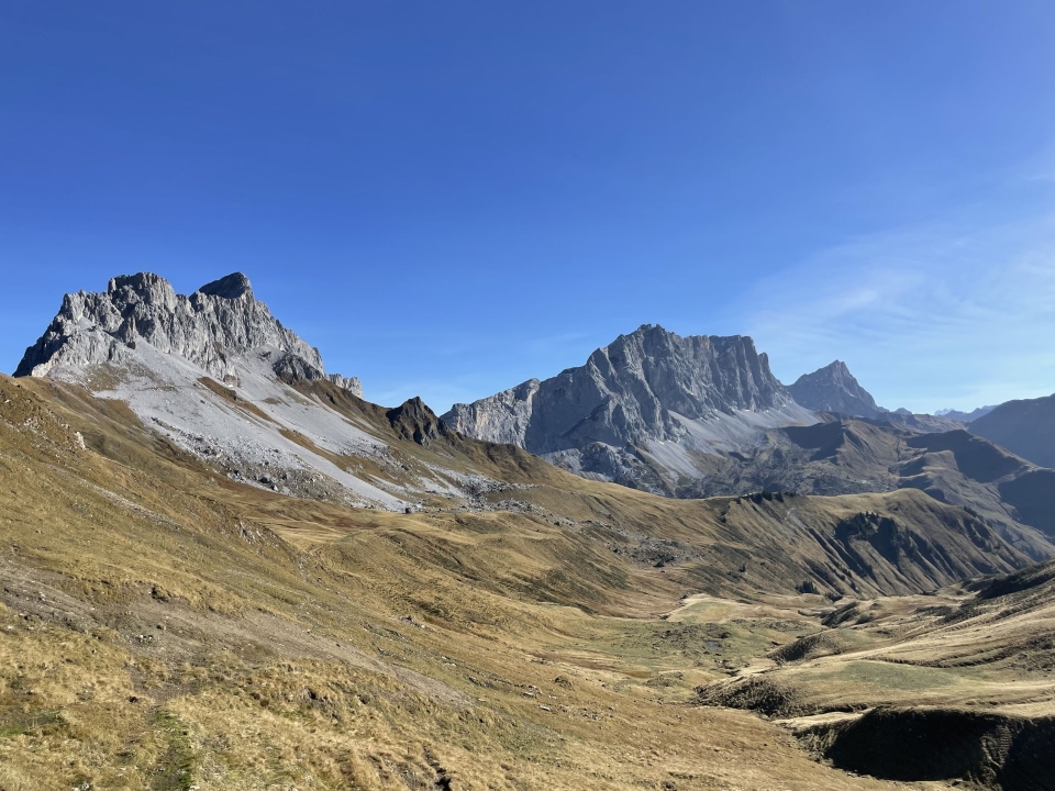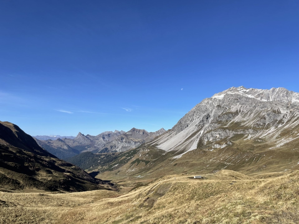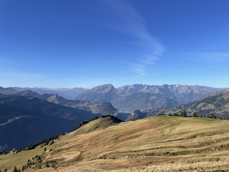 Es herbstet überall. Die Bäume sind gelb, die Wiesen braun, die Kühe wieder im Tal. Der Himmel klar und die Sicht fantastisch. Ich bin alleine, und werde das fast den ganzen Tag bleiben. Die Herbstferien sind vorbei, es ist der „Montag danach“. Es ist still, keine Insekten, keine Vögel, kein Wasser, nur Stille. So steige ich im forschen Schritt über die Flanken des Salginatals zum Fadurer Fürggli hoch. Nach einer Kurve treffe ich auf eine grosse Herde Gämsen, die mindestens so erschrecken wie ich. Innert Sekunden verschwinden sie galoppierend in die Büsche, ich kann nicht einmal ein Foto machen. Schade, aber janu. Besser als Herdenhunde, die sich gegen ungewollte Besucher zur Wehr setzen.