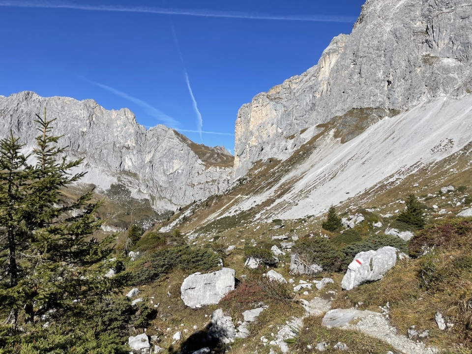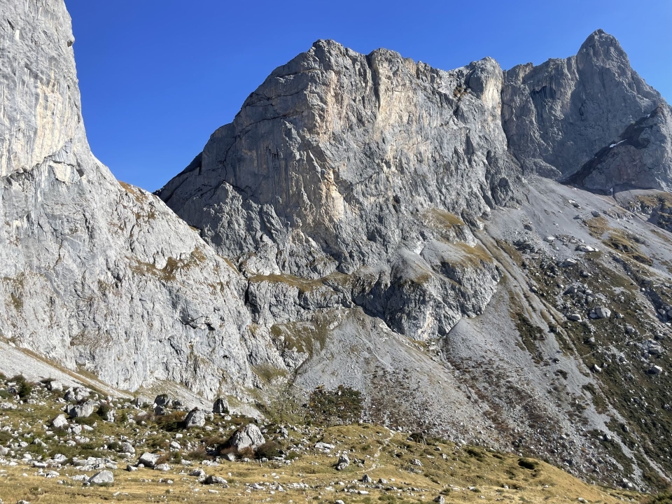 Von nun an folge ich dem Prättigauer Höhenweg, der unter den südlichen Wänden des Chilchlispitzes zum Schweizertor hinunterführt. Dieses Schweizertor ist ein weiterer Pass nach Österreich, nun aber von ganz anderem Kaliber als das Cavälljoch! Ein schmaler, schwer zugänglicher Schlitz zwischen den Kalkwänden des Chilchlispitzes und der Drusenfluh, eine Laune der Natur. Das muss ich zwar nicht hin (es liegt nicht auf der Route), aber das reizt mich und ich mache den Abstecher.