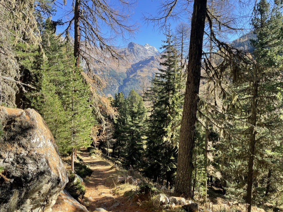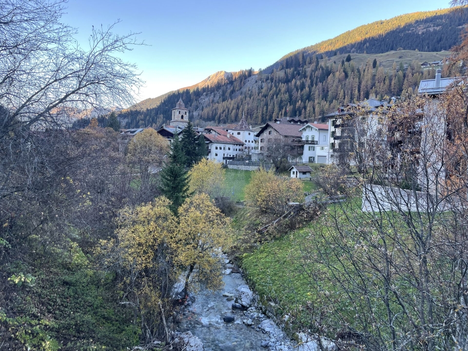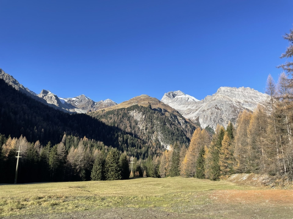 Gemächlich trotte ich den Pfad hinunter, der mich bald durch einen gelben Lärchenwald führt, dessen herabgefallene Nadeln wie ein goldener Teppich unter meinen Füssen knistern. Die Farben des Waldes sind auch im Schatten warm und einladend, beinahe märchenhaft – es ist, als würden die Bäume mir einen Abschiedsgruss schenken, bevor ich ins Tal zurückkehre. Weiter unten füllen knorrige Föhren und stolze Tannen den Hang. Schliesslich stapfe ich über saftige Kuhweiden, die ins frühabendliche Bergün führen.