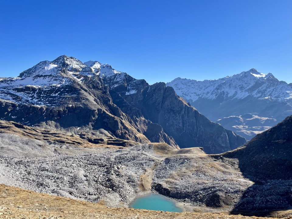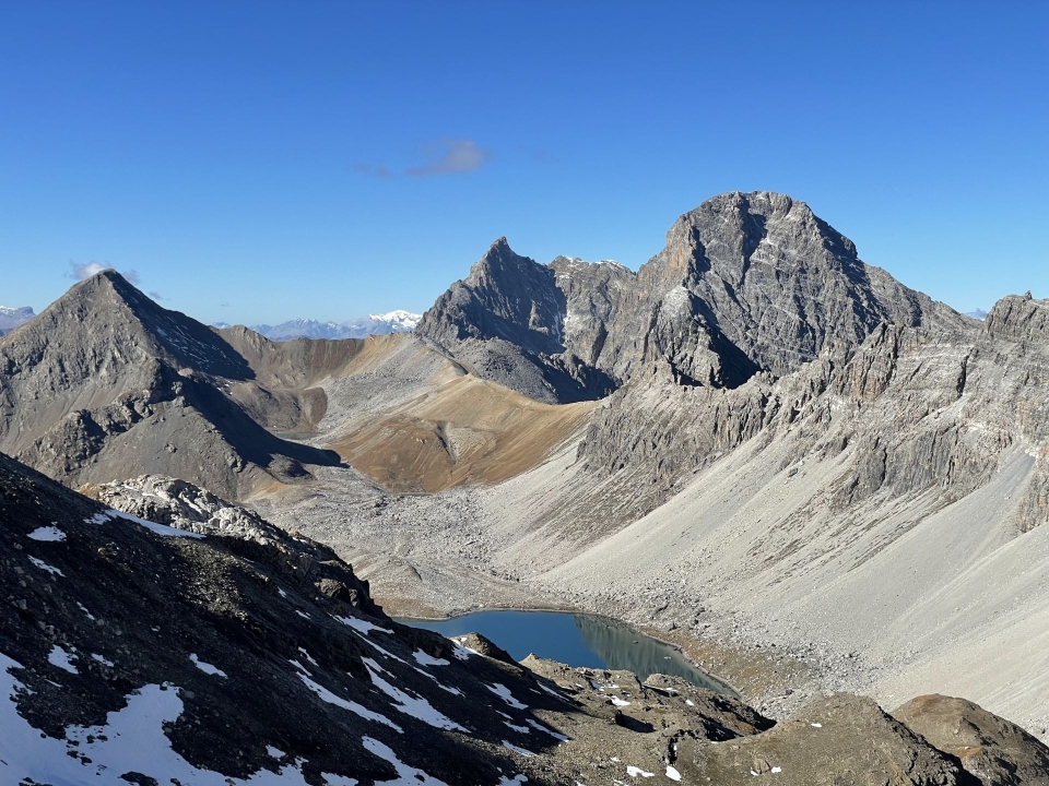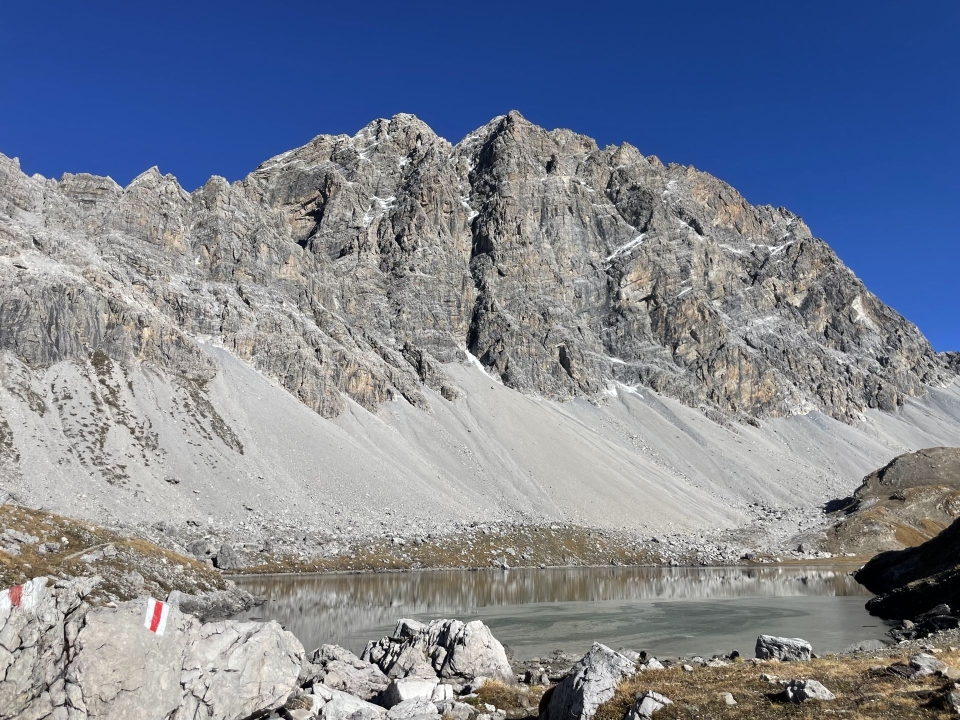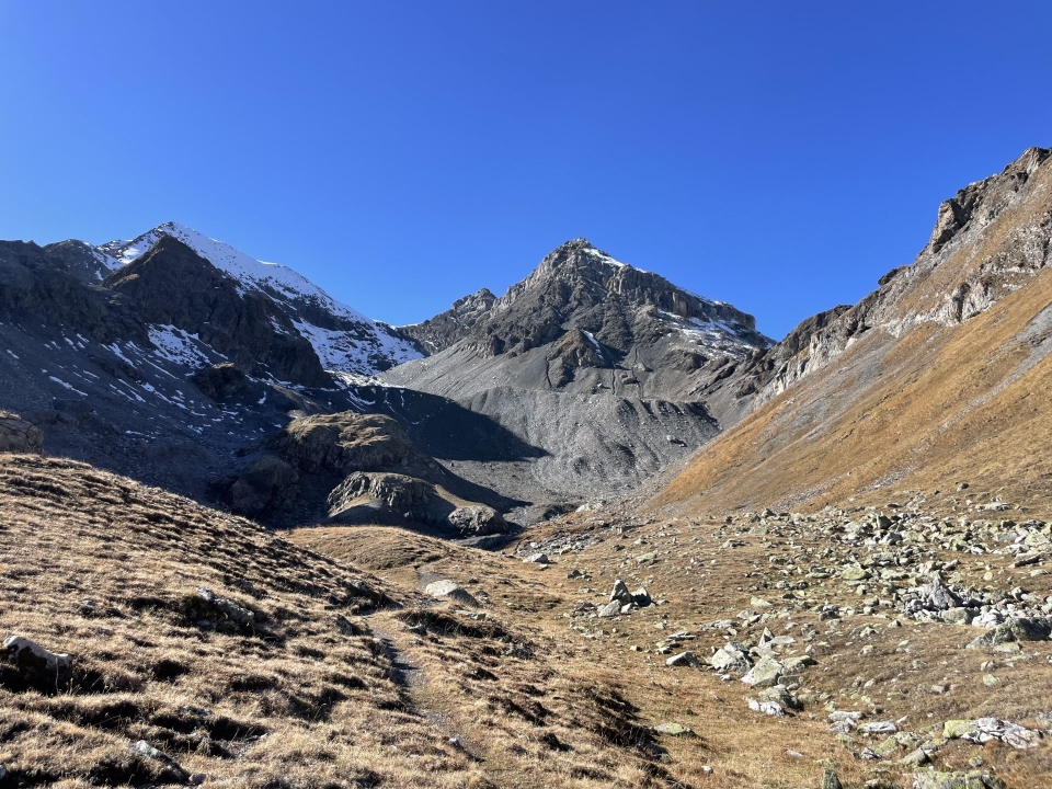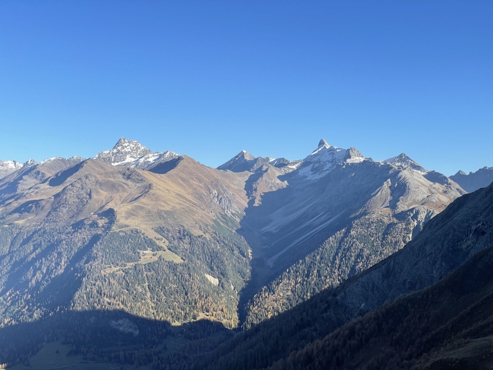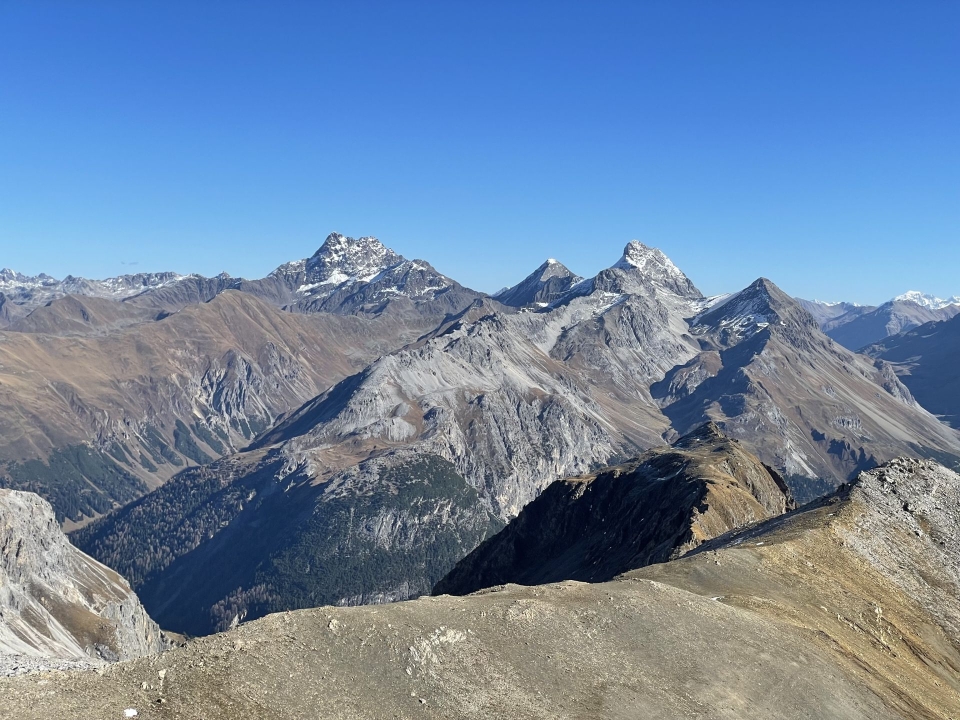 Oben angekommen halte ich den Atem an: Die Aussicht ist überwältigend. Vor mir liegen die schroffen Kalkwände des Piz Ela und seiner Gefährten, der Piz Mitgel und der Piz Tinizong. Wie erhabene Wächter inmitten einer majestätischen Stille. Hinter mir die Weite des Albulatals mit seinen prägnanten Gipfeln an der Grenze zum Engadin. Das Herbstlicht begeistert, auch wenn die Böden fahl sind. Nur das gemäss anderen Wanderberichten in Aussicht gestellte Steinwild fehlt.