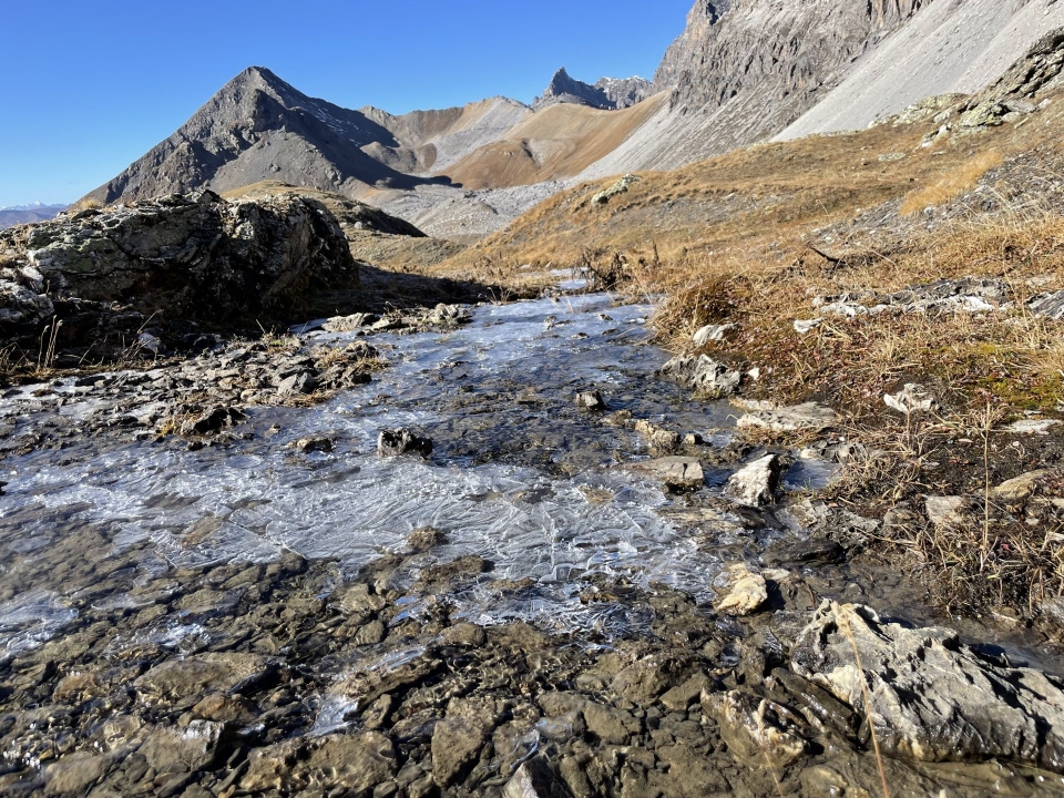 Die Felsen der Südwände des Piz Ela leuchten im Sonnenlicht, während ich konzentriert auf den Pfad blicke, der nun steil hinabführt zu zwei stillen Seen, deren Oberfläche bereits ein zarter Hauch von Eis bedeckt. Auch Schwarzeis glänzt schon auf den schattigen Passagen. Vorsicht ist angebracht. Beim Lai Mort steige ich wieder in voller Sonne auf den rot schimmernden Rücken, der mich auf den Ela-Pass führt.