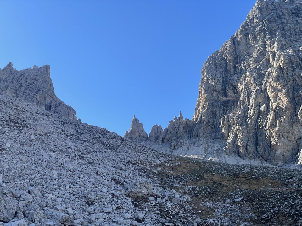 Je höher ich steige, desto lichter wird der Wald – die gelbbraunen Lärchen weichen allmählich der offenen Alp, und der Blick wird weiter. Im Val Tschitta sind die Murmeltiere offenbar schon im Winterschlaf. Dafür erkenne ich in der Ferne die Nachbarn des Piz Ela, dessen markanter Gipfel wenig später auch stolz ins Tal hineinschaut – als ob er mich einlädt, näherzukommen und seine Geschichten zu hören. Das Wetter ist perfekt: Im Schatten ist es kühl, fast beissend, doch in der Sonne wärmt mich eine sanfte Glut. Ich lasse die Kälte hinter mir, hebe den Blick dankbar zur Sonne, und erklimme den steiler werdenden Weg hinauf zur Furchela da Tschitta. An der Schneegrenze drehe ich in ein steiniges Tälchen, durchschreite später eine steinige Mondlandschaft und sehe bald die Passtafel auf über 2800m.