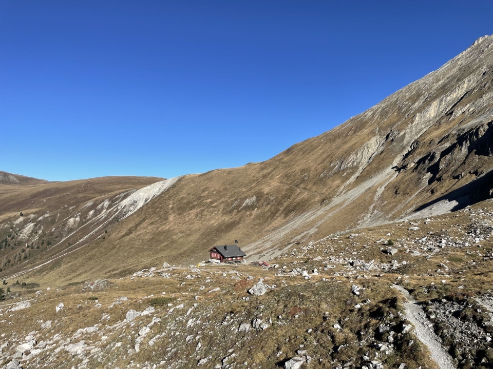 Vom Ela-Pass traversiere ich zum Orgelpass. Das wäre grundsätzlich nicht nötig, aber es reizt mich, diesen besonderen Ort wiederzusehen. Die Felsformationen sind bizarr und eindrucksvoll – Spitzen und Säulen wie Orgelpfeifen, die in den Himmel ragen. Dann führt der Pfad hinab zur kleinen Ela-Hütte, wo ich mir eine kurze Rast gönne. Ein knuspriger Ovo-Riegel spendet frische Energie. Langsam kauend geniesse ich das spezielle „Oktoberfeeling“: Die tiefstehende Sonne, die friedvolle Stille, die Natur ist bereit für den Winterschlaf.