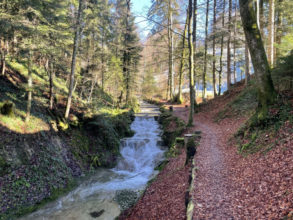 Es ist kalt. Ich ziehe meine Wollmütze tief über die Ohren und die Augenbrauen hinunter. Das Frösteln überwinde ich mit zügigem Laufen. Viel Auge habe ich für die kleinen Läden an der Hauptgasse von Wald nicht. Ich ziele auf den schnellsten Weg zum Sagenraintobel. Di8e leichten Steigungen bringt die erwünschte Erwärmung, bald lasse ich die letzten Häuserzeilen des Dorfs hinter mir. Einmal im Tobel angekommen erfreue ich mich über das Wasserspiel – und bald auch über die Sonne, die ihre zarten Winterstrahlen durch die Baumkronen gleiten lässt.