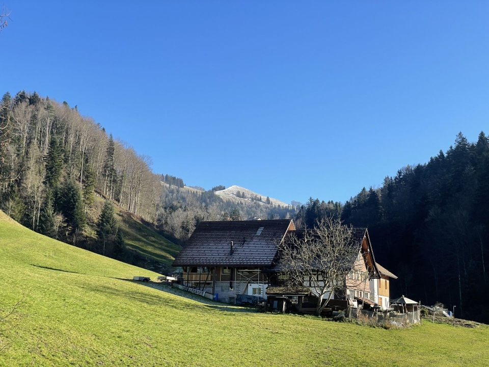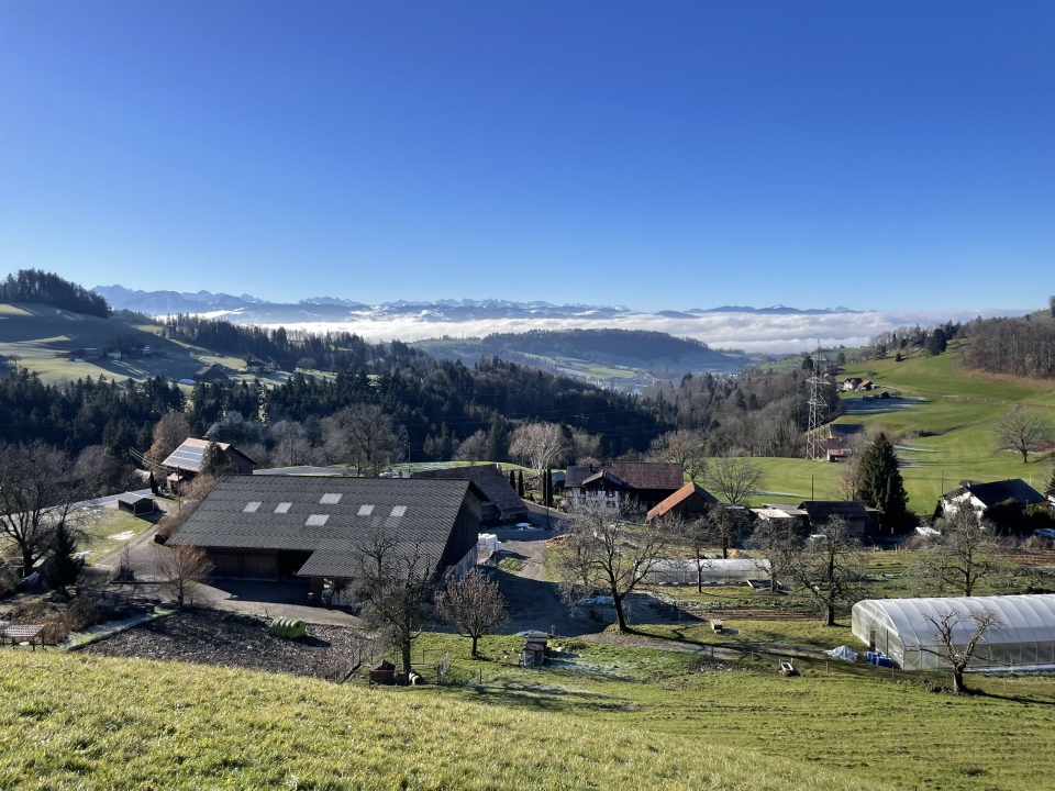 Der Pfad führt genussvoll entlang des Bachlaufs nach oben. Eigentlich kommt die Abzweigung zum Josenberg fast zu früh. Ich wäre dem quirlenden Wasser gerne noch ein wenig weiter gefolgt. Der Graspfad schlängelt sich recht steil über Wiesland hoch. Die schmucken Bauernhäuser wirkend einladend. Auch der freiwerdende Blick über die Baumkronen zum Nebelmeer über dem Zürichsee und zu den Alpen gefällt. Bis zum Waldrand sammeln sich die ersten Schweisstropfen unter der Mütze an. Es prickelt, aber abziehen mag ich sie nicht, der Wind ist eisig.