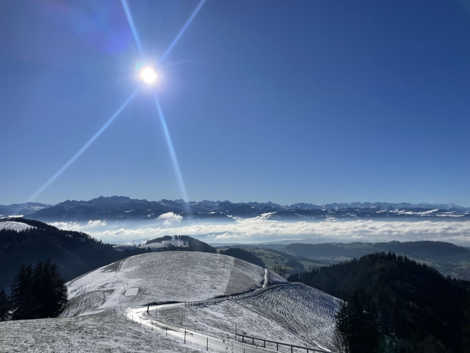 Das Gipfelchen begrüsst mich mit seiner Rundbank und der besten Aussicht des Zürcher Oberlands. 360 Grad gibt es sonst nirgends in diesem stark bewaldeten Wandergebiet. Im Osten grüsst der majestätische Alpstein, im Süden die Alpenkette und im Westen die Zürcher Seenlandschaft. Sehr schön! Wenn nur der Eiswind nicht wäre…