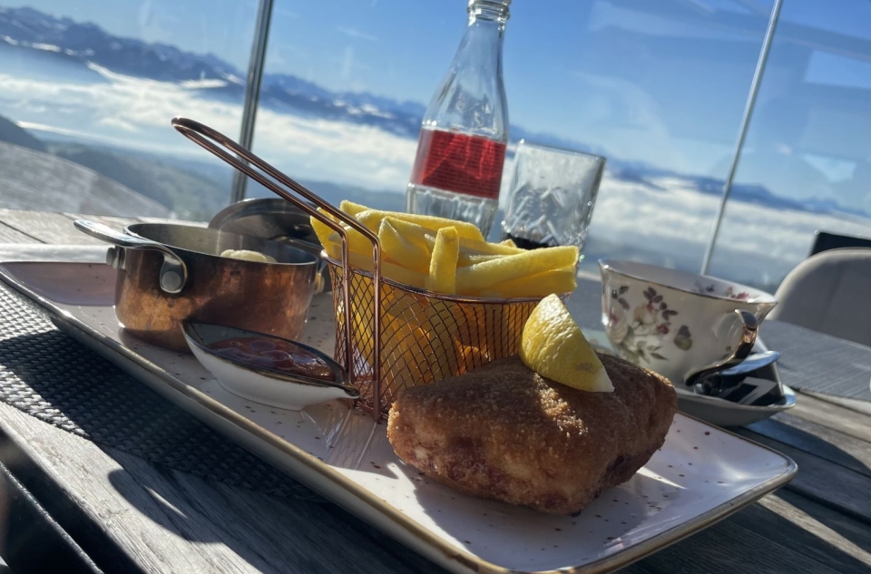 Nach einer guten Stunde wandern betrete ich die Alpwirtschaft Scheidegg. Die Einkehr ist ein Muss – denn hier wird richtig gut gekocht. Viele andere Ausflugsrestaurants könnten sich hier ein Stück abschneiden. Mein Cordon bleu ist eine Wucht, der sämige Käse fliesst wie warme Lava über den Teller. Auch die Pommes im Gitterli sind ein Genuss. Und sogar der Espresso schmeckt hier besser als anderswo. Und dazu noch die herrliche Sicht in die Alpen! Etwas für alle Sinne! Zum Glück sind die ersten Wanderminuten danach flach und der folgende, kurze Aufstieg auf den Hüttchopf nicht besonders steil!
