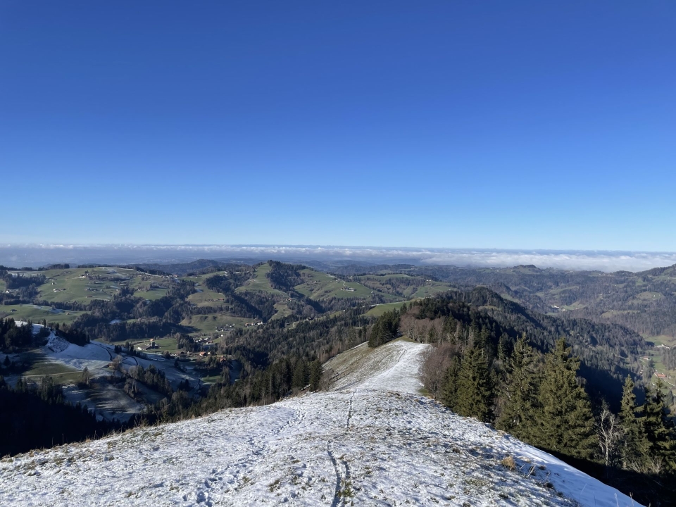 Ich verlasse den Graskopf und folge dem Gratverlauf nach Norden. Es läuft sich angenehm im gemächlichen Abstiegswinkel hinunter nach Tannen. Auch hier sind die Seitenblicke immer wieder reizend. Sei es zum Hörnli, zum Schnebelhorn und in die Tiefe des Tösssprungs zur Rechten, oder auf der anderen Seite zum Bachtel und ins Tösstal. Von Tannen steige ich direkt nach Fischental ab. Nur steigt jetzt plötzlich mein iPhone aus – es ist ihm wohl zu kalt geworden. Keine Fotos mehr! Das gemächliche Jakobsweg-Teilstück zurück nach Wald – mit dem Besuch der „Crèmeschnitte“ unter dem Wissenbachfall – beschreibe ich Euch lieber später einmal mit Bilder…