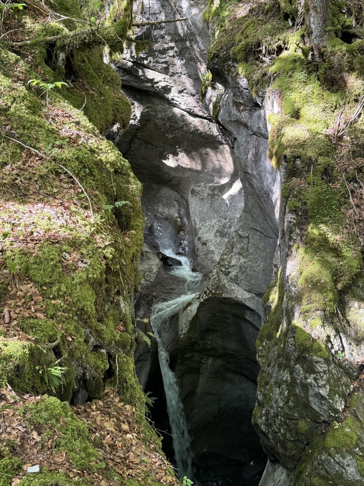 Wer es gemächlicher mag, folgt der Teerstrasse hinauf ins Lipplisbüel. Ich bevorzuge diesen wilden Pfad, der bald durch urwüchsigen Uferwald ins Hüribachtobel führt. Tief hat sich der Bach in die Landschaft gegraben, Gletschermühlen zeugen von der Kraft der Zeit – fantastisch!