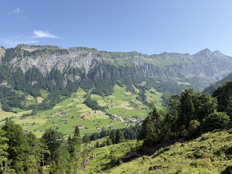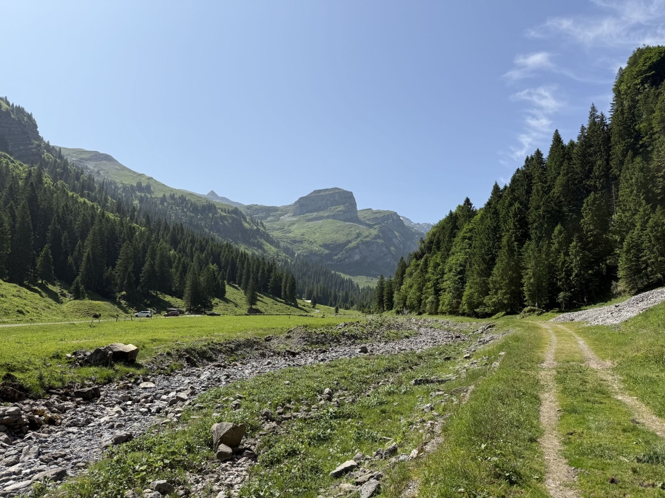 Beim ersten Bauernhof flacht der Hang etwas ab und lädt ein in den schattigen Wald. Eine stattliche Geisengruppe grast friedlich, ihre Glöcklein weben einen feinen Klangteppich – Bergromantik pur. Ich halte kurz inne und blicke zurück ins Tal, das nun schon tief unter mir liegt. Dann verschluckt mich der Wald – seine Kühle tut gut an diesem heissen Tag. Der Bach bleibt mein Begleiter – ab und zu auch ein paar Meter auf Asphalt –, aber der Weg steigt nun angenehm an.