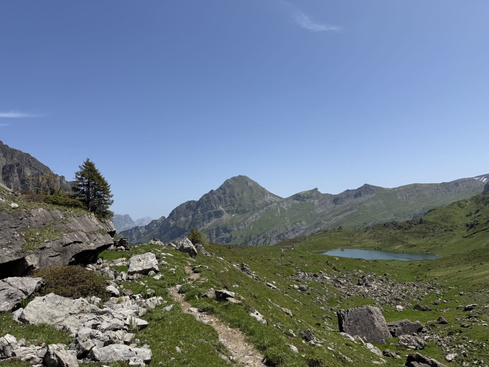 Das idyllische Seenalpseeli und der einzige Baum im Tal – exponiert auf einem Felsen.