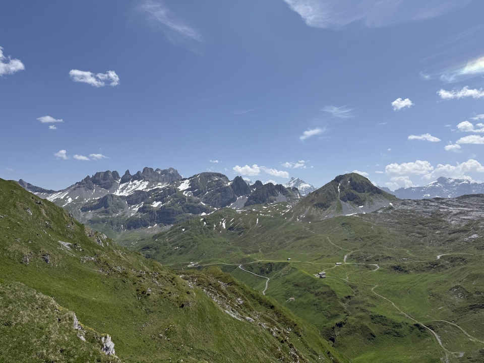 Die Urner Riesen mit Windgällen, Balmeten und dem mächtigen Glattfirn. Der Surenenpass ist schon bald schneefrei