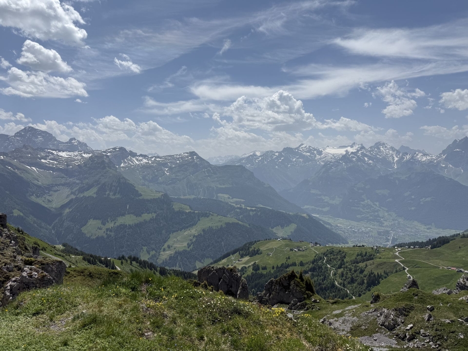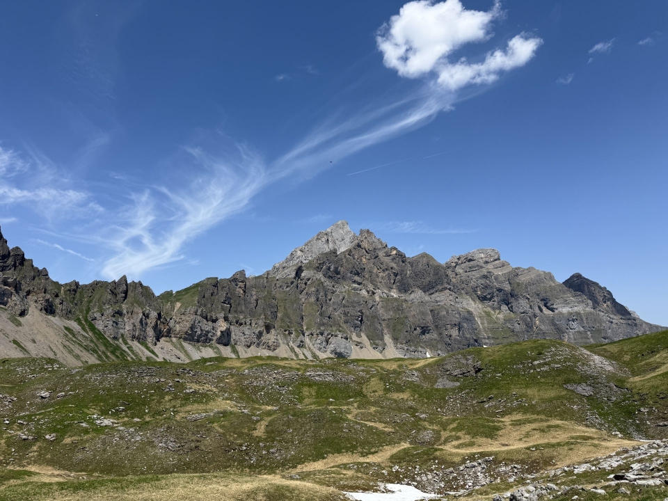 Am Talende wird es noch einmal steil, und meine Beine werden schwer. In einem Anflug von Übermut versuche ich, über die Oberfrutt zur Lang Egg etwas abzukürzen – um vermeintlich ein paar Höhenmeter zu sparen. Natürlich geht das schief: Am Ende stehen 50 Höhenmeter mehr und ein Kratzer am Schienbein zu Buche. Zum Glück kann ich über mich selbst lachen. Immerhin ist die Aussicht auf den Urner Alpenkranz nun so betörend schön, dass alle Müdigkeit verfliegt. Höchste Zeit für eine Genusspause mit Rundblick, Schoggiriegel und Hörnlisalat!
